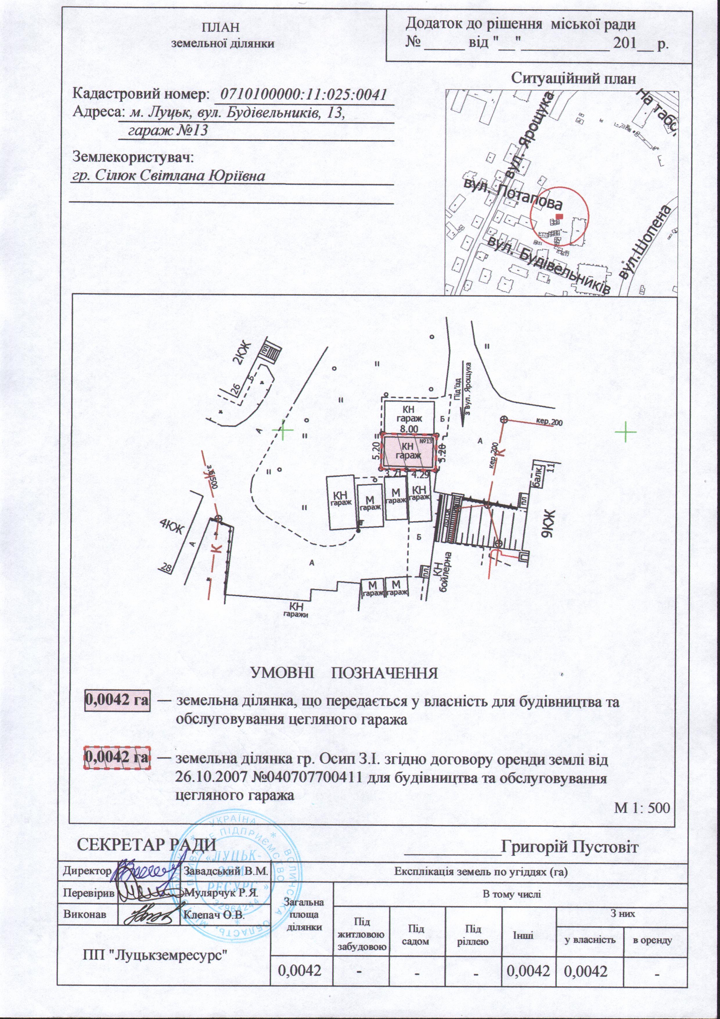 Розглянувши клопотання гр. Сілюк Світлани Юріївни щодо передачі безоплатно у власність земельної ділянки на вул. Будівельників, 13, гараж № 13 для будівництва та обслуговування цегляного гаража, договір оренди землі гр. Осип Зінаїди Іванівни, зареєстрований в Державному реєстрі земель від 26.10.2007 за № 040707700411, інформацію Луцької об’єднаної державної податкової інспекції Волинської області ДПС щодо відсутності заборгованості по орендній платі за землю, технічну документацію з інвентаризації земельної ділянки гр. Сілюк Світлани Юріївни, керуючись статтями 12, 81, 90-91, 116, 118, 121, 125-126 Земельного кодексу України та ст. 26 Закону України «Про місцеве самоврядування в Україні», міська рада