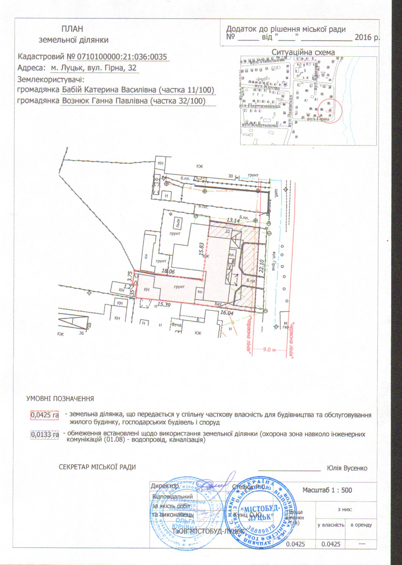 2. Передати громадянам Бабій Катерині Василівні (частка 11/100), Вознюк Ганні Павлівні (частка 32/100) безоплатно у спільну часткову власність земельну ділянку на вул. Гірній, 32 площею 0,0425 га, кадастровим номером 0710100000:21:036:0035 для будівництва та обслуговування жилого будинку, господарських будівель і споруд, згідно з додатком.