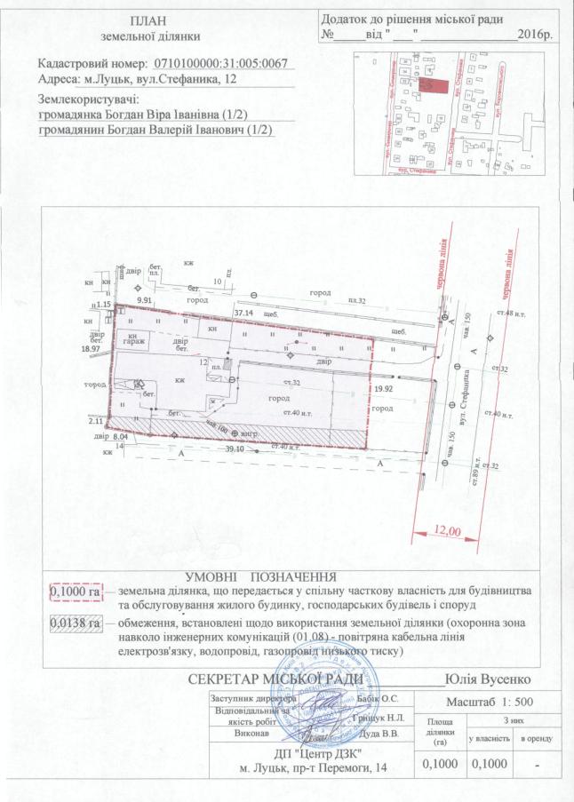2. Передати громадянам Богдан Вірі Іванівні (частка 1/2), Богдану Валерію Івановичу (частка 1/2) безоплатно у спільну часткову власність земельну ділянку на вул. Стефаника, 12 площею 0,1000 га, кадастровим номером 0710100000:31:005:0067 для будівництва та обслуговування жилого будинку, господарських будівель і споруд, згідно з додатком.