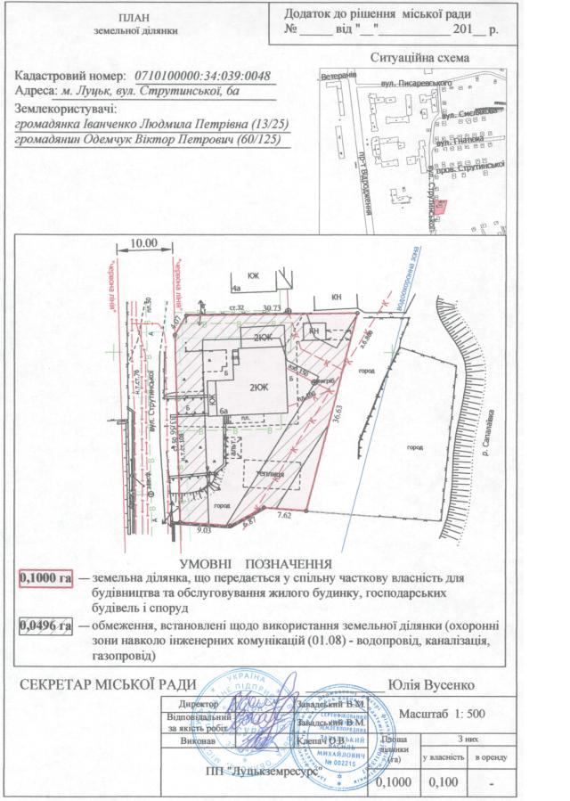 2. Передати громадянам Іванченко Людмилі Петрівні (частка 13/25), Одемчуку Віктору Петровичу (частка 60/125) безоплатно у спільну часткову власність земельну ділянку на вул. Струтинської, 6а площею 0,1000 га, кадастровим номером 0710100000:34:039:0048 для будівництва та обслуговування жилого будинку, господарських будівель і споруд, згідно з додатком.