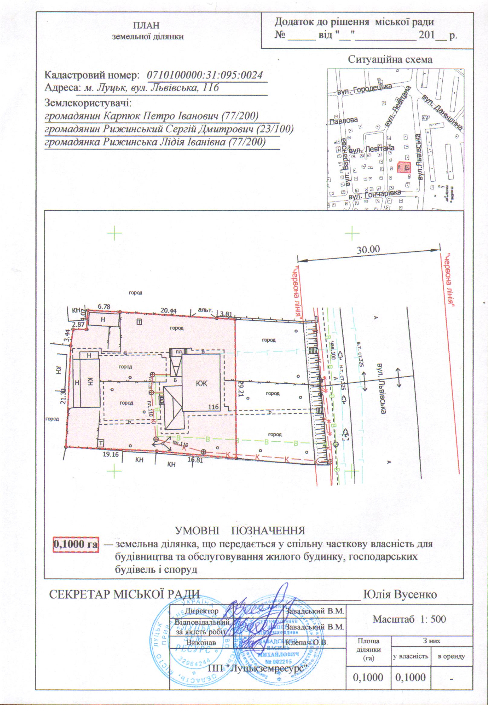 2. Передати громадянам Карпюку Петру Івановичу (частка 77/200), Рижинському Сергію Дмитровичу (частка 23/100), Рижинській Лідії Іванівні (частка 77/200) безоплатно у спільну часткову власність земельну ділянку на вул. Львівській, 116 площею 0,1000 га, кадастровим номером 0710100000:31:095:0024 для будівництва та обслуговування жилого будинку, господарських будівель і споруд, згідно з додатком.
