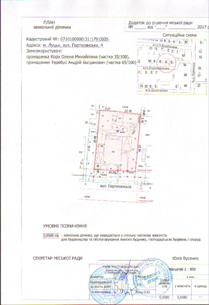 2. Передати громадянам Корх Олені Михайлівні (частка 35/100), Теребусу Андрію Богдановичу (частка 65/100) безоплатно у спільну часткову власність земельну ділянку на вул. Партизанській, 4 площею 0,0580 га, кадастровим номером 0710100000:31:179:0020 для будівництва та обслуговування жилого будинку, господарських будівель і споруд, згідно з додатком.