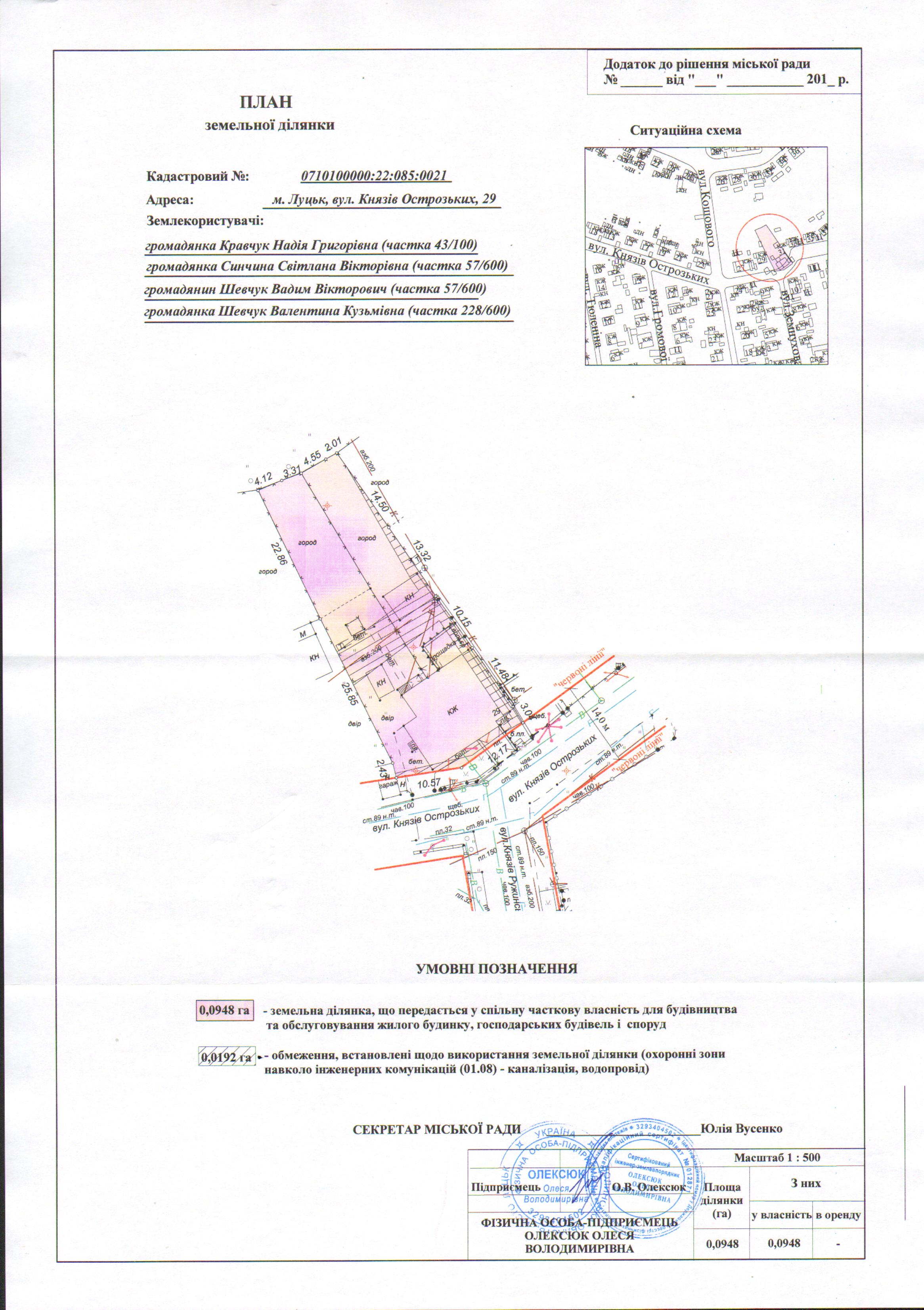2. Передати громадянам Кравчук Надії Григорівні (частка 43/100), Синчиній Світлані Вікторівні (частка 57/600), Шевчуку Вадиму Вікторовичу (частка 57/600), Шевчук Валентині Кузьмівні (частка 228/600) безоплатно у спільну часткову власність земельну ділянку на вул. Князів Острозьких, 29 площею 0,0948 га, кадастровим номером 0710100000:22:085:0021 для будівництва та обслуговування жилого будинку, господарських будівель і споруд, згідно з додатком.