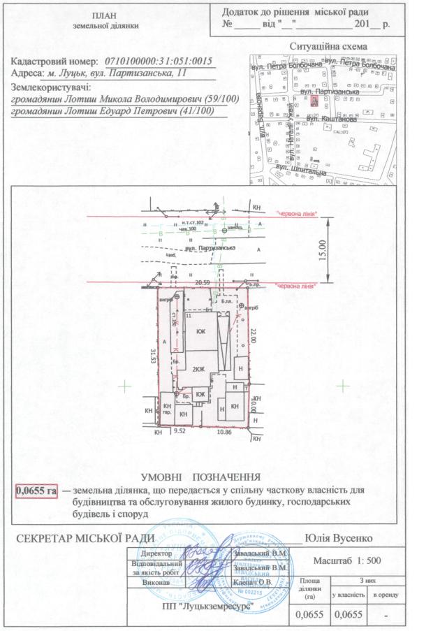 2. Передати громадянам Лотишу Миколі Володимировичу (частка 59/100), Лотишу Едуарду Петровичу (частка 41/100) безоплатно у спільну часткову власність земельну ділянку на вул. Партизанській, 11 площею 0,0655 га, кадастровим номером 0710100000:31:051:0015 для будівництва та обслуговування жилого будинку, господарських будівель і споруд, згідно з додатком.