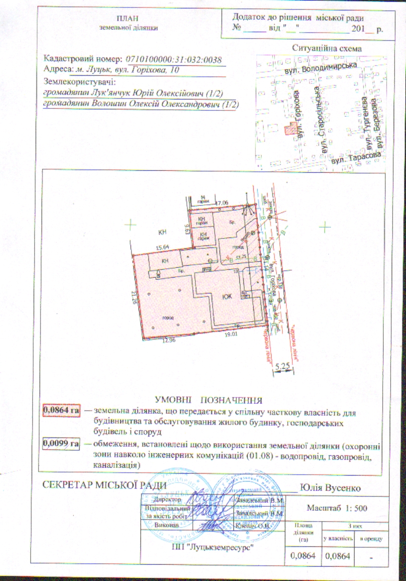 2. Передати громадянам Лук’янчуку Юрію Олексійовичу (частка 1/2), Волошину Олексію Олександровичу (частка 1/2) безоплатно у спільну часткову власність земельну ділянку на вул. Горіховій, 10 площею 0,0864 га, кадастровим номером 0710100000:31:032:0038 для будівництва та обслуговування жилого будинку, господарських будівель і споруд, згідно з додатком.