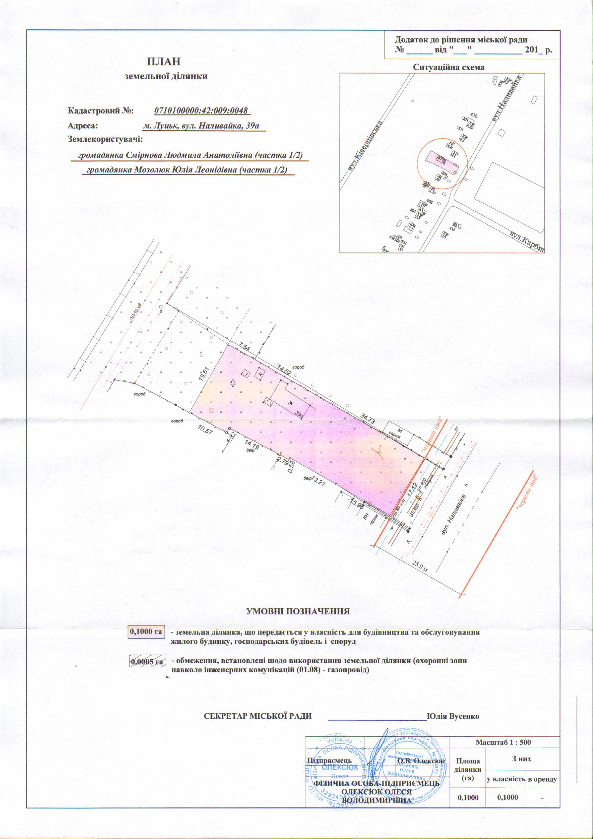 2. Передати громадянам Мозолюк Юлії Леонідівні (частка 1/2), Смірновій Людмилі Анатоліївні (частка 1/2) безоплатно у спільну часткову власність земельну ділянку на вул. Наливайка, 39а площею 0,1000 га, кадастровим номером 0710100000:42:009:0048 для будівництва та обслуговування жилого будинку, господарських будівель і споруд, згідно з додатком.