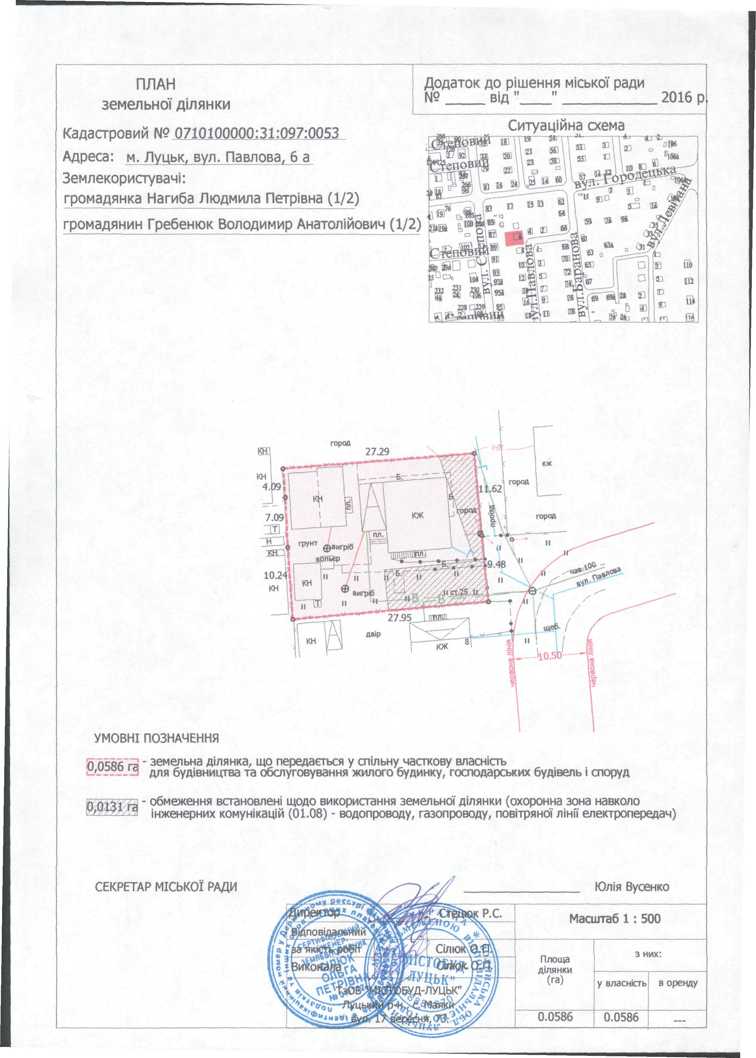 2. Передати громадянам Нагибі Людмилі Петрівні (частка 1/2), Гребенюку Володимиру Анатолійовичу (частка 1/2) безоплатно у спільну часткову власність земельну ділянку на вул. Павлова, 6а площею 0,0586 га, кадастровим номером 0710100000:31:097:0053 для будівництва та обслуговування жилого будинку, господарських будівель і споруд, згідно з додатком.