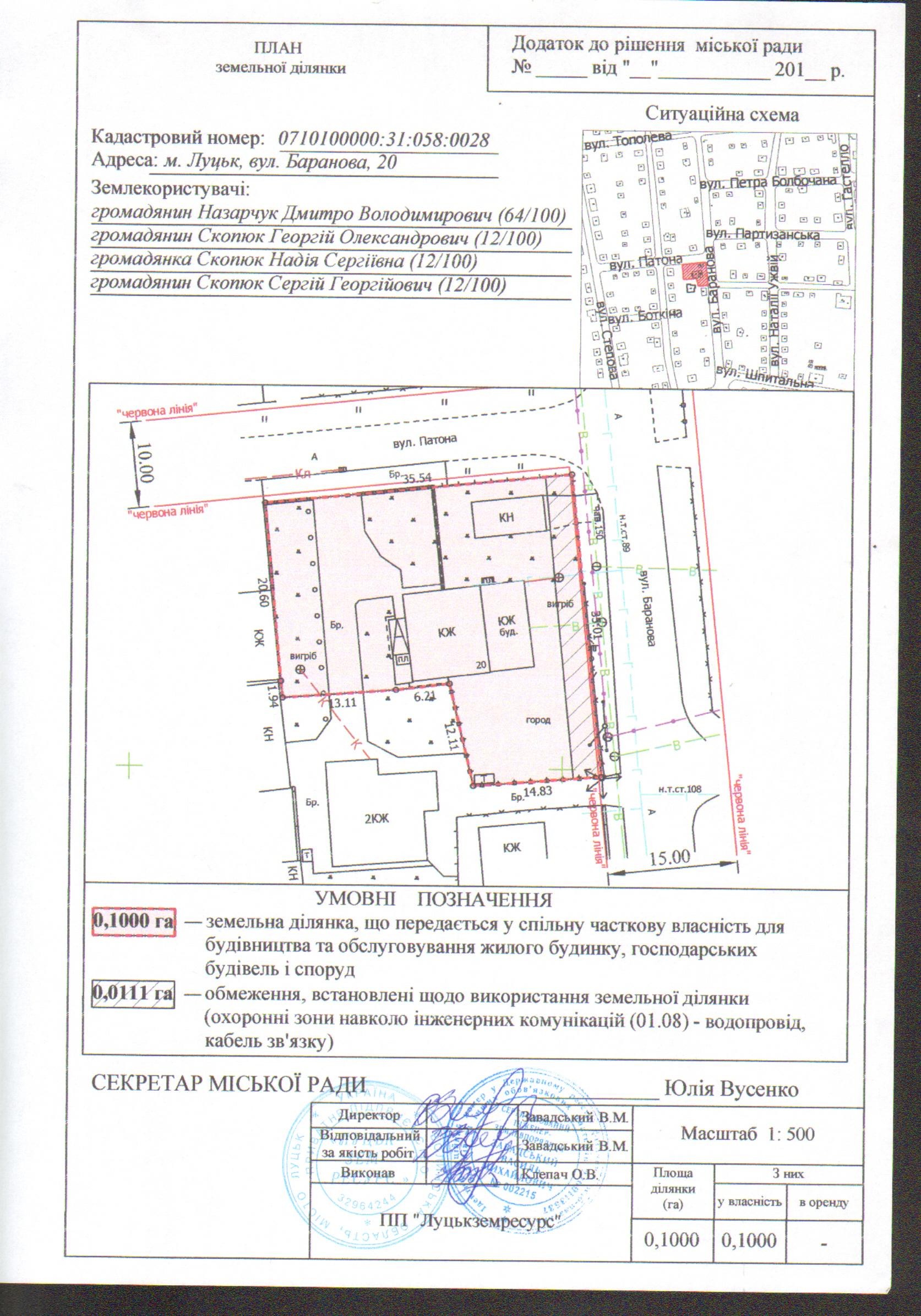 2. Передати громадянам Назарчуку Дмитру Володимировичу (частка 64/100), Скопюку Георгію Олександровичу (частка 12/100), Скопюк Надії Сергіївні (частка 12/100), Скопюку Сергію Георгійовичу (частка 12/100) безоплатно у спільну часткову власність земельну ділянку на вул. Баранова, 20 площею 0,1000 га, кадастровим номером 0710100000:31:058:0028 для будівництва та обслуговування жилого будинку, господарських будівель і споруд, згідно з додатком.
