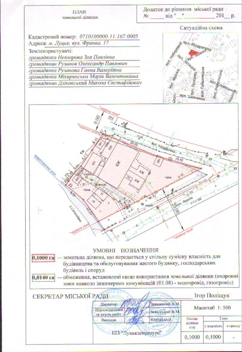 2. Передати громадянам Невзоровій Зої Павлівні, Рузанову Олександру Павловичу, Рузановій Ганні Валеріївні, Міхиринській Марії Валентинівні, Дзіковському Миколі Євстафійовичу безоплатно у спільну сумісну власність земельну ділянку на вул. Франка, 17 площею 0,1000 га, кадастровим номером 0710100000:11:167:0005 для будівництва та обслуговування жилого будинку, господарських будівель і споруд, згідно з додатком.