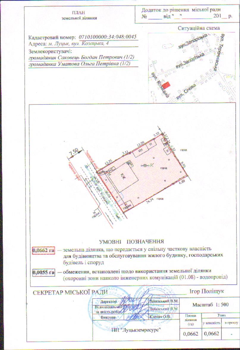 2. Передати громадянам Саковцю Богдану Петровичу (частка 1/2), Уматовій Ользі Петрівні (частка 1/2) безоплатно у спільну часткову власність земельну ділянку на вул. Козацькій, 4 площею 0,0662 га, кадастровим номером 0710100000:34:048:0045 для будівництва та обслуговування жилого будинку, господарських будівель і споруд, згідно з додатком.