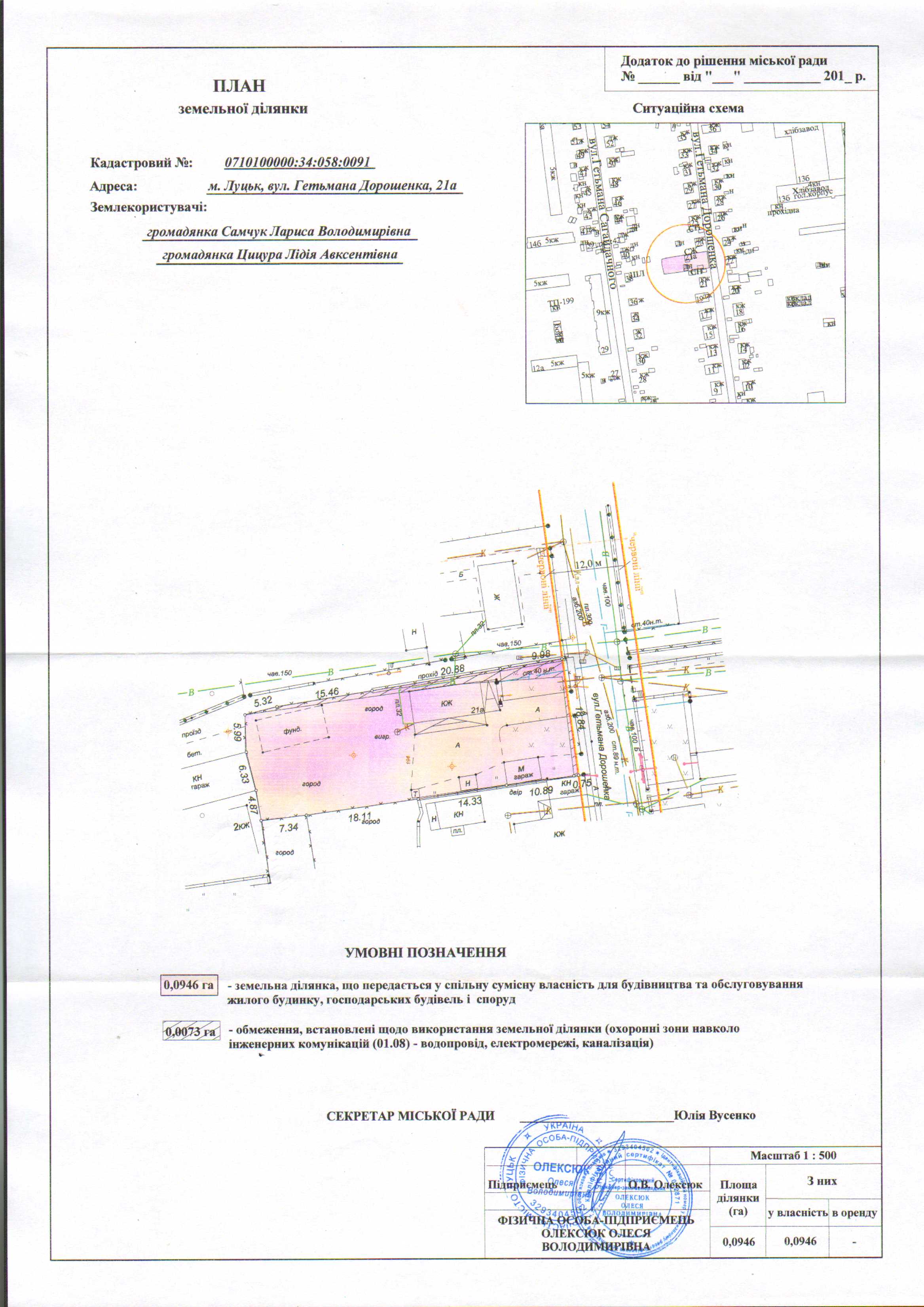 2. Передати громадянам Самчук Ларисі Володимирівні, Цицурі Лідії Авксентівні безоплатно у спільну сумісну власність земельну ділянку на вул. Гетьмана Дорошенка, 21а площею 0,0946 га, кадастровим номером 0710100000:34:058:0091 для будівництва та обслуговування жилого будинку, господарських будівель і споруд, згідно з додатком.