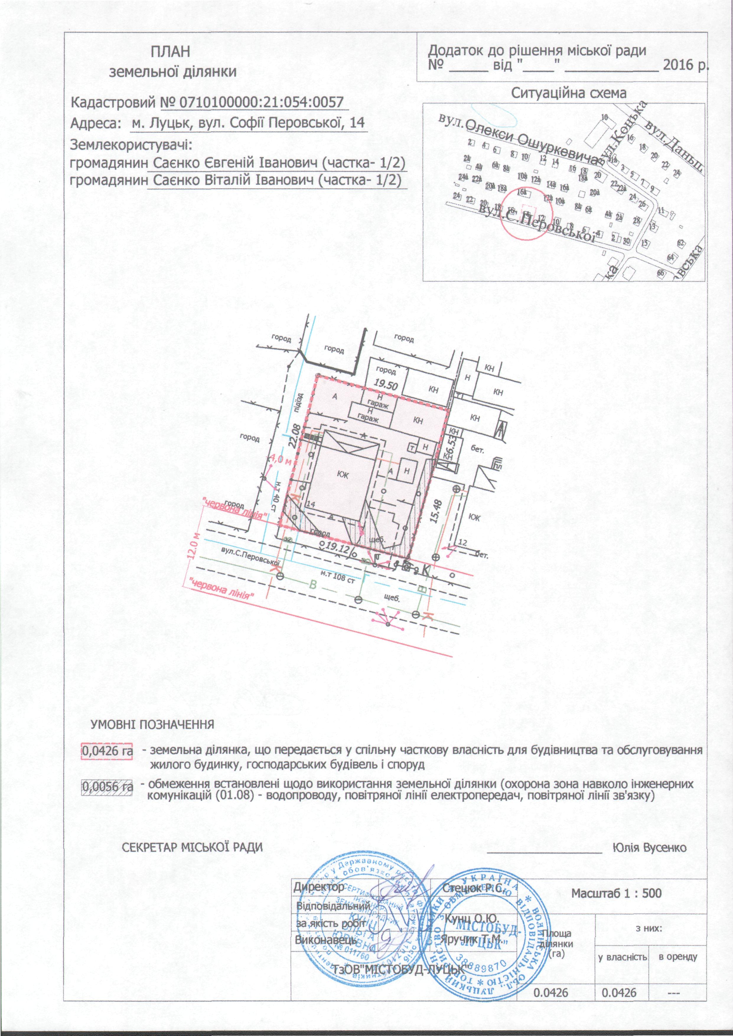 2. Передати громадянам Саєнку Євгенію Івановичу (частка 1/2), Саєнку Віталію Івановичу (частка 1/2) безоплатно у спільну часткову власність земельну ділянку на вул. Софії Перовської, 14 площею 0,0426 га, кадастровим номером 0710100000:21:054:0057 для будівництва та обслуговування жилого будинку, господарських будівель і споруд, згідно з додатком.