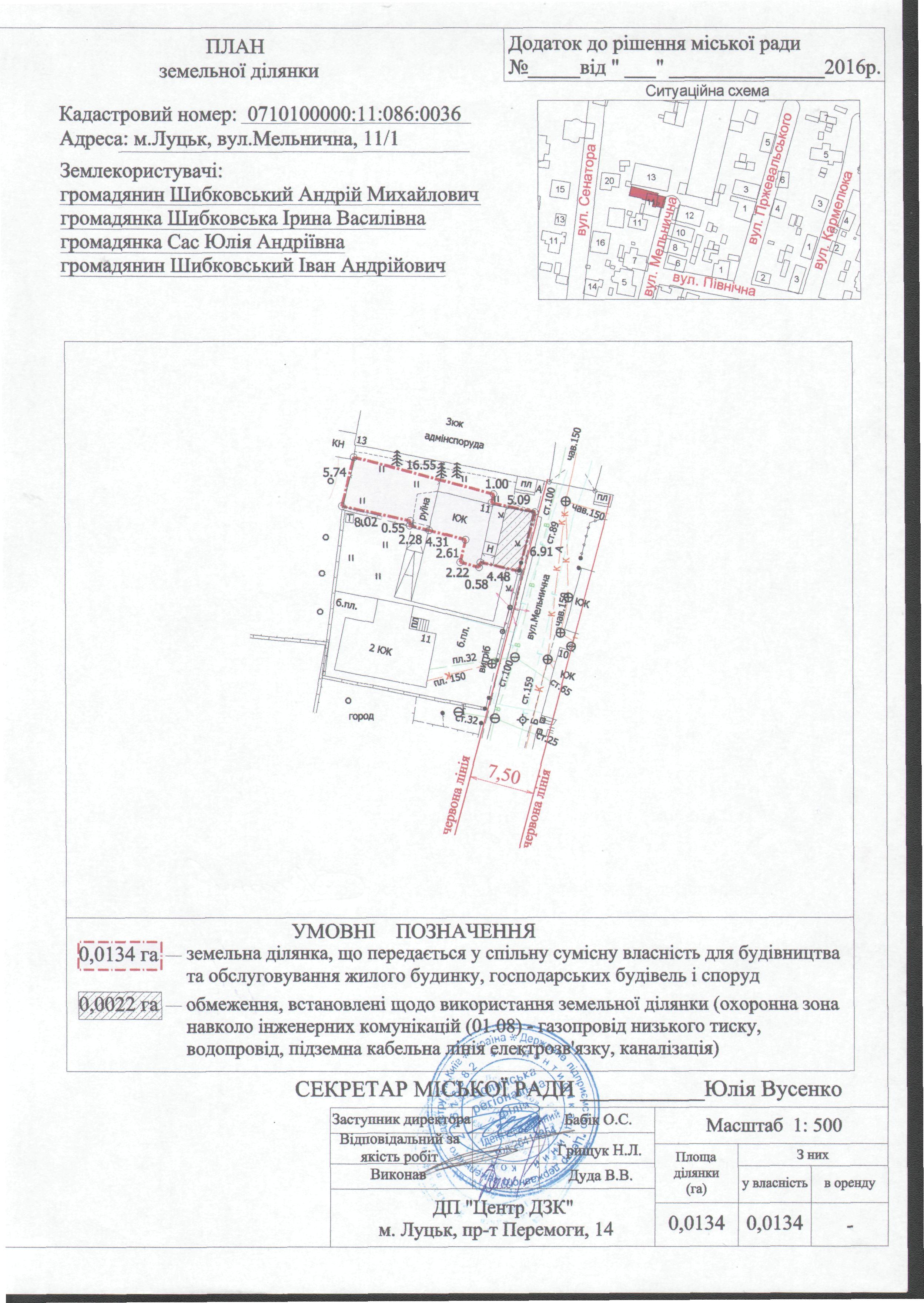 2. Передати громадянам Шибковському Андрію Михайловичу, Шибковській Ірині Василівні, Шибковському Івану Андрійовичу, Сас Юлії Андріївні безоплатно у спільну сумісну власність земельну ділянку на вул. Мельничній, 11/1 площею 0,0134 га, кадастровим номером 0710100000:11:086:0036 для будівництва та обслуговування жилого будинку, господарських будівель і споруд, згідно з додатком.