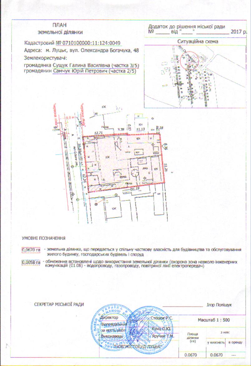 2. Передати громадянам Сущук Галині Василівні (частка 3/5), Самчуку Юрію Петровичу (частка 2/5) безоплатно у спільну часткову власність земельну ділянку на вул. Олександра Богачука, 48 площею 0,0670 га, кадастровим номером 0710100000:11:124:0049 для будівництва та обслуговування жилого будинку, господарських будівель і споруд, згідно з додатком.