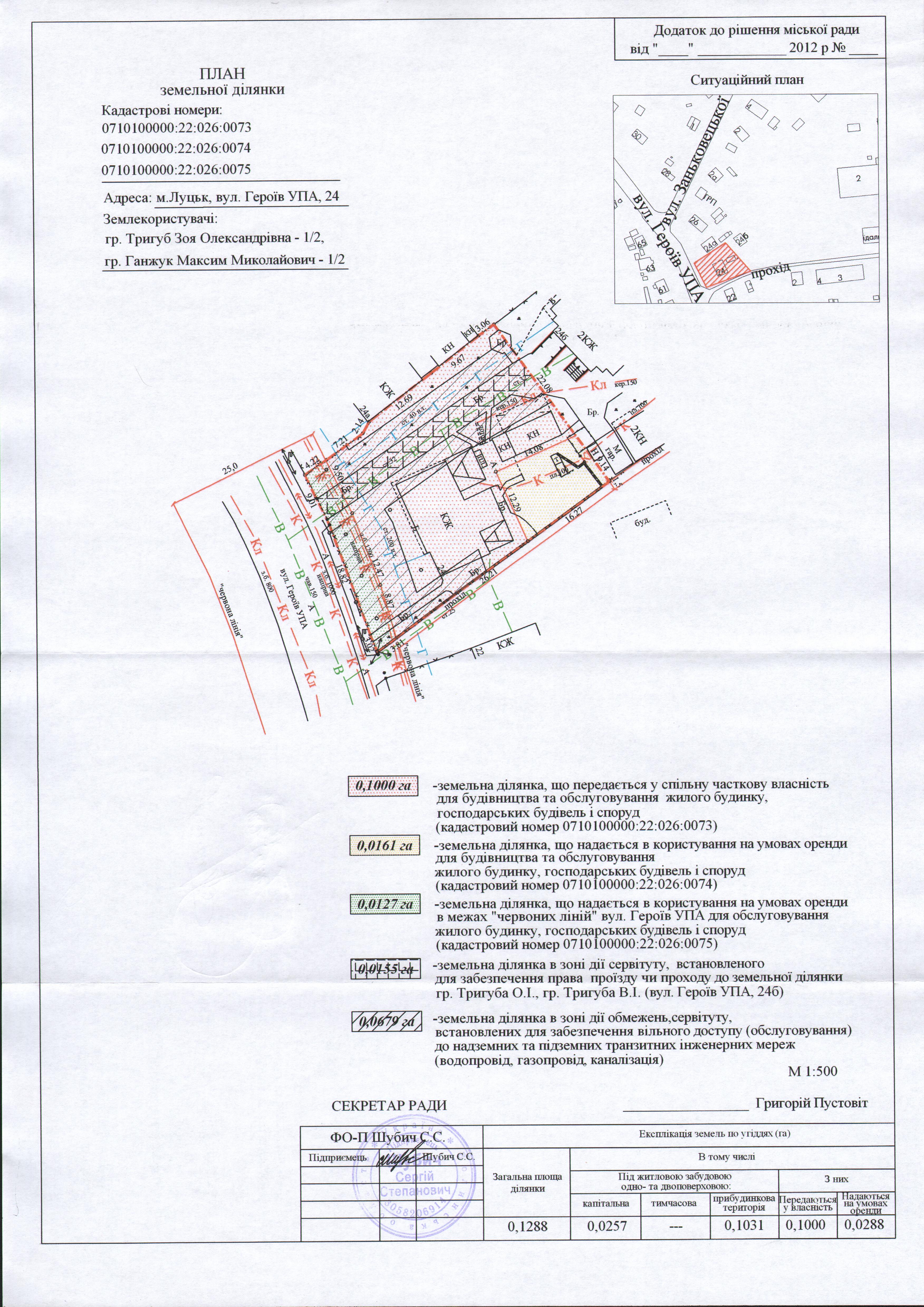 Розглянувши клопотання громадян Тригуб Зої Олександрівни, Ганжука Максима Миколайовича щодо передачі безоплатно у спільну часткову власність та надання в користування на умовах оренди земельних ділянок на вул. Героїв УПА, 24 для будівництва та обслуговування жилого будинку, господарських будівель і споруд, технічну документацію з інвентаризації земельної ділянки громадян Тригуб Зої Олександрівни, Ганжука Максима Миколайовича, керуючись статтями 12, 81, 86-88, 90, 91, 93, 96, 116, 118, 121, 123-126 Земельного кодексу України, Законом України «Про оренду землі» та ст. 26 Закону України «Про місцеве самоврядування в Україні», міська рада