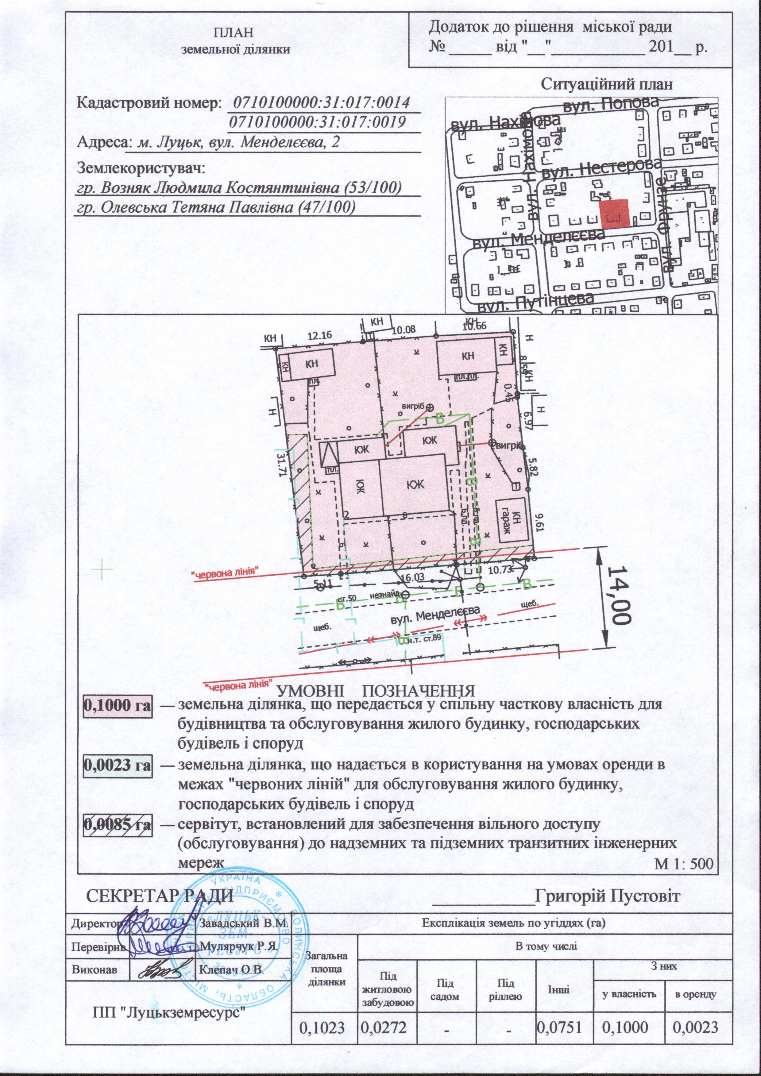 1. Передати громадянам Возняк Людмилі Костянтинівні (частка 53/100), Олевській Тетяні Павлівні (частка 47/100) безоплатно у спільну часткову власність земельну ділянку на вул. Менделєєва, 2 площею 0,1000 га для будівництва та обслуговування жилого будинку, господарських будівель і споруд, згідно з додатком.