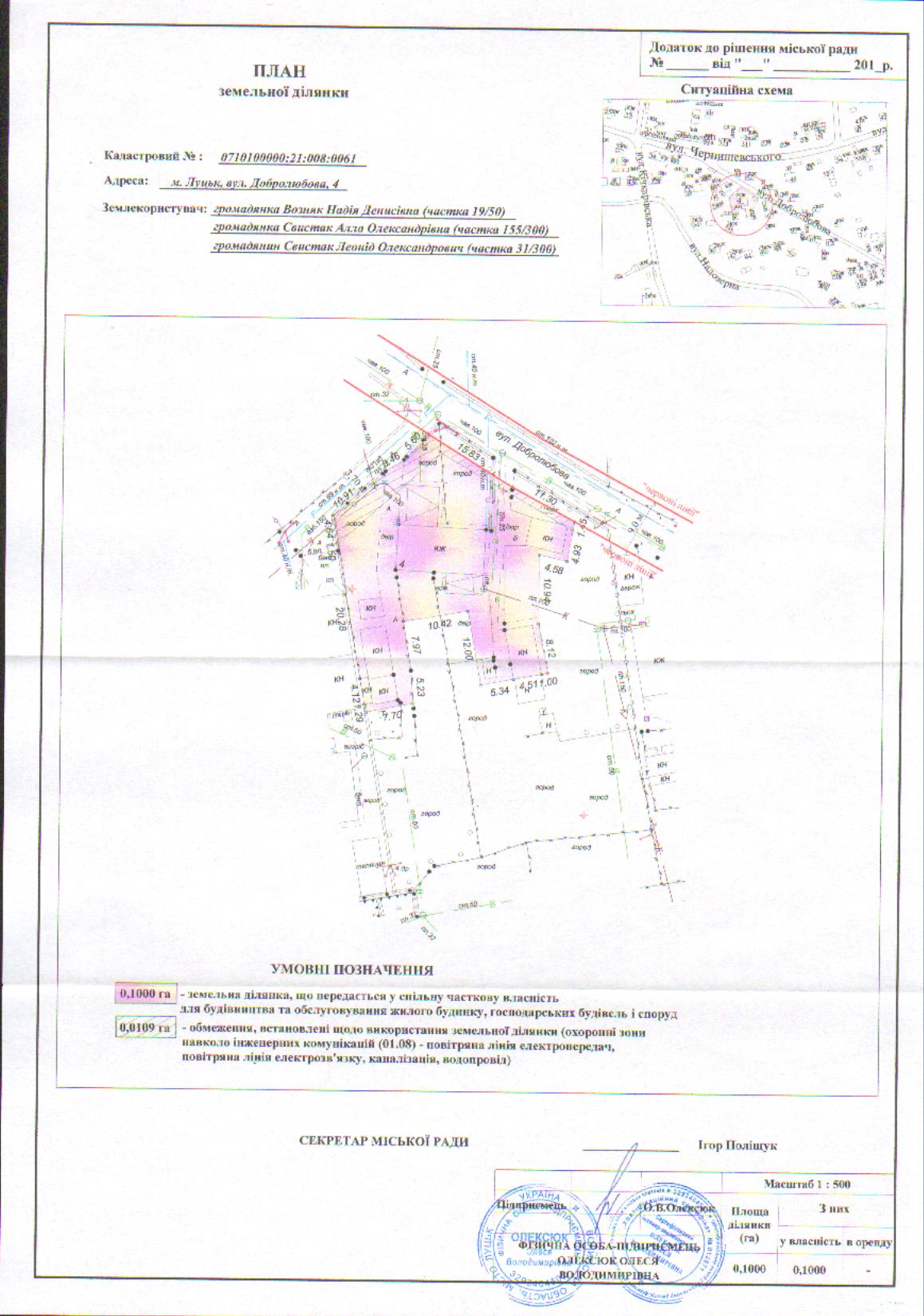 1. Затвердити громадянам Возняк Надії Денисівні (частка 19/50), Свистак Аллі Олександрівні (частка 155/300), Свистаку Леоніду Олександровичу (частка 31/300) технічну документацію із землеустрою щодо встановлення (відновлення) меж земельної ділянки в натурі (на місцевості) на вул. Добролюбова, 4 площею 0,1000 га, кадастровим номером 0710100000:21:008:0061 для будівництва та обслуговування жилого будинку, господарських будівель і споруд.