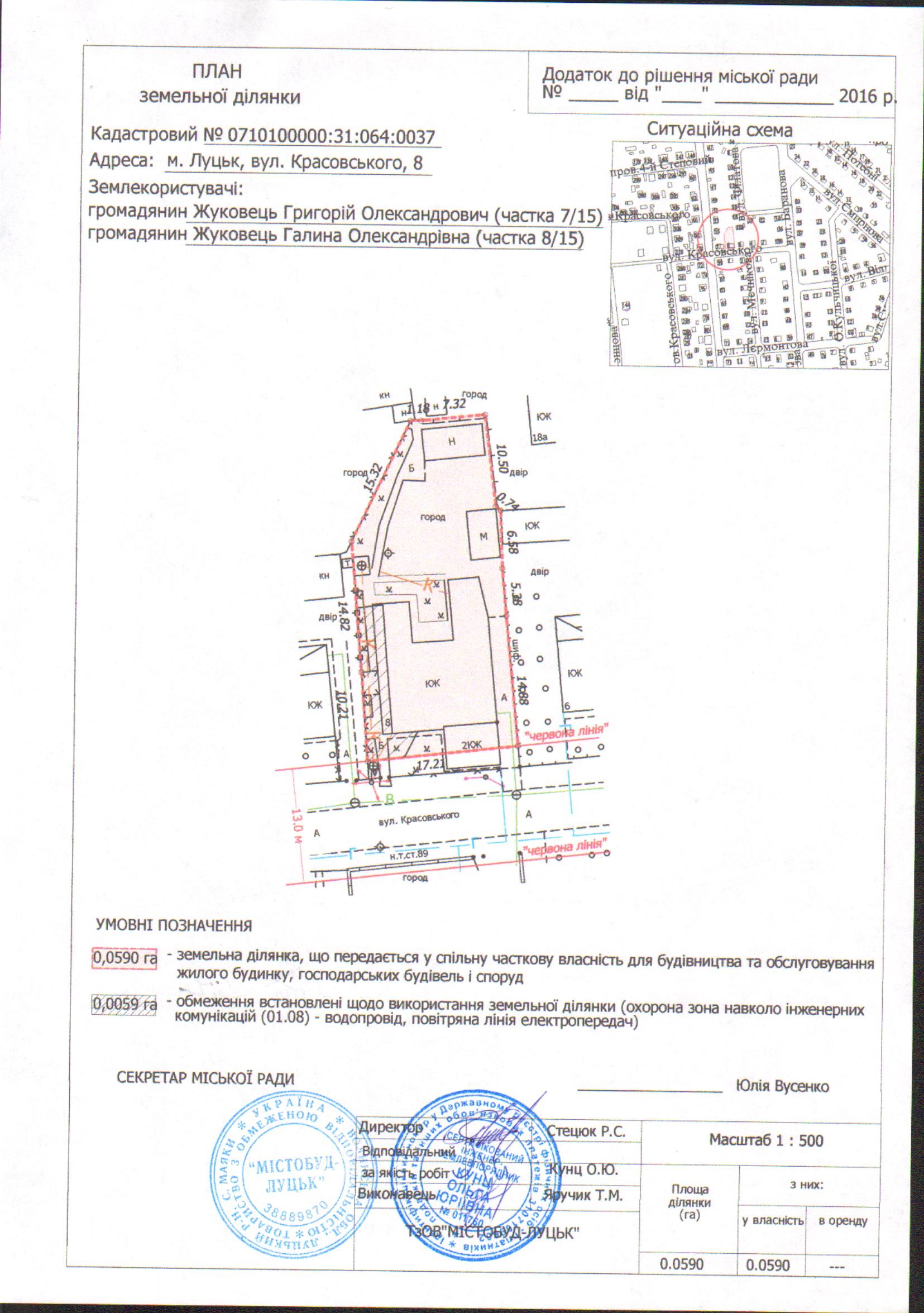 2. Передати громадянам Жуковцю Григорію Олександровичу (частка 7/15), Жуковець Галині Олександрівні (частка 8/15) безоплатно у спільну часткову власність земельну ділянку на вул. Красовського, 8 площею 0,0590 га, кадастровим номером 0710100000:31:064:0037 для будівництва та обслуговування жилого будинку, господарських будівель і споруд, згідно з додатком.