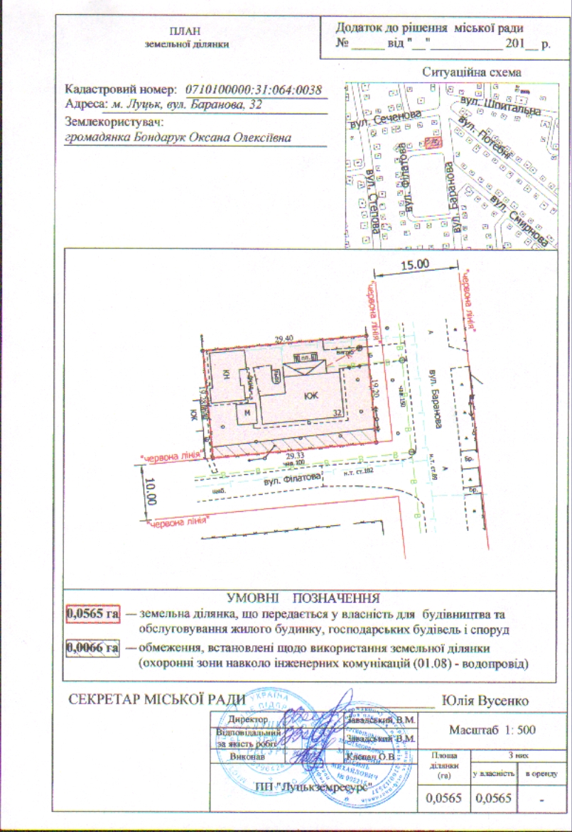 2. Передати громадянці Бондарук Оксані Олексіївні безоплатно у власність земельну ділянку на вул. Баранова, 32 площею 0,0565 га, кадастровим номером 0710100000:31:064:0038 для будівництва та обслуговування жилого будинку, господарських будівель і споруд, згідно з додатком.