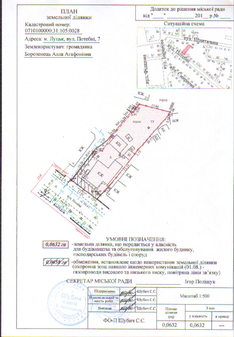 2. Передати громадянці Борозенець Аллі Агафонівні безоплатно у власність земельну ділянку на вул. Потебні, 7 площею 0,0632 га, кадастровим номером 0710100000:31:105:0028 для будівництва та обслуговування жилого будинку, господарських будівель і споруд, згідно з додатком.