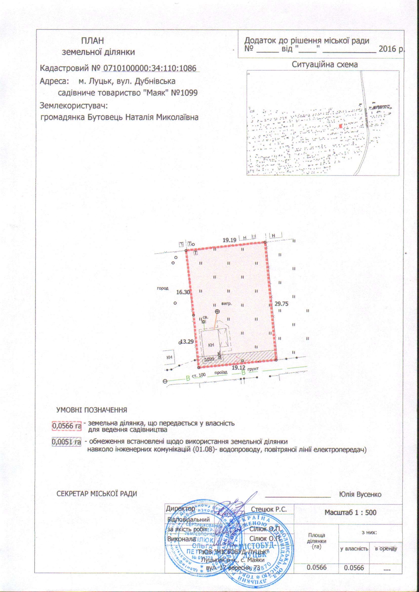 2. Передати громадянці Бутовець Наталії Миколаївні безоплатно у власність земельну ділянку на вул. Дубнівській в садівничому товаристві «Маяк» № 1099 площею 0,0566 га, кадастровим номером 0710100000:34:110:1086 для ведення садівництва, згідно з додатком.