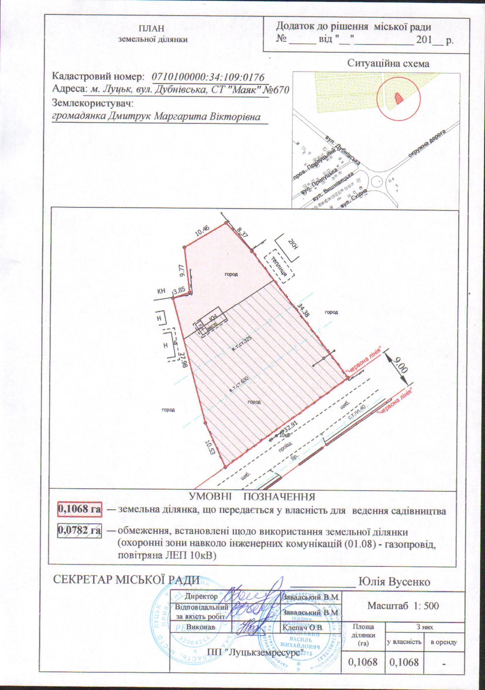 2. Передати громадянці Дмитрук Маргариті Вікторівні безоплатно у власність земельну ділянку на вул. Дубнівській в садівничому товаристві «Маяк» № 670 площею 0,1068 га, кадастровим номером 0710100000:34:109:0176 для ведення садівництва, згідно з додатком.