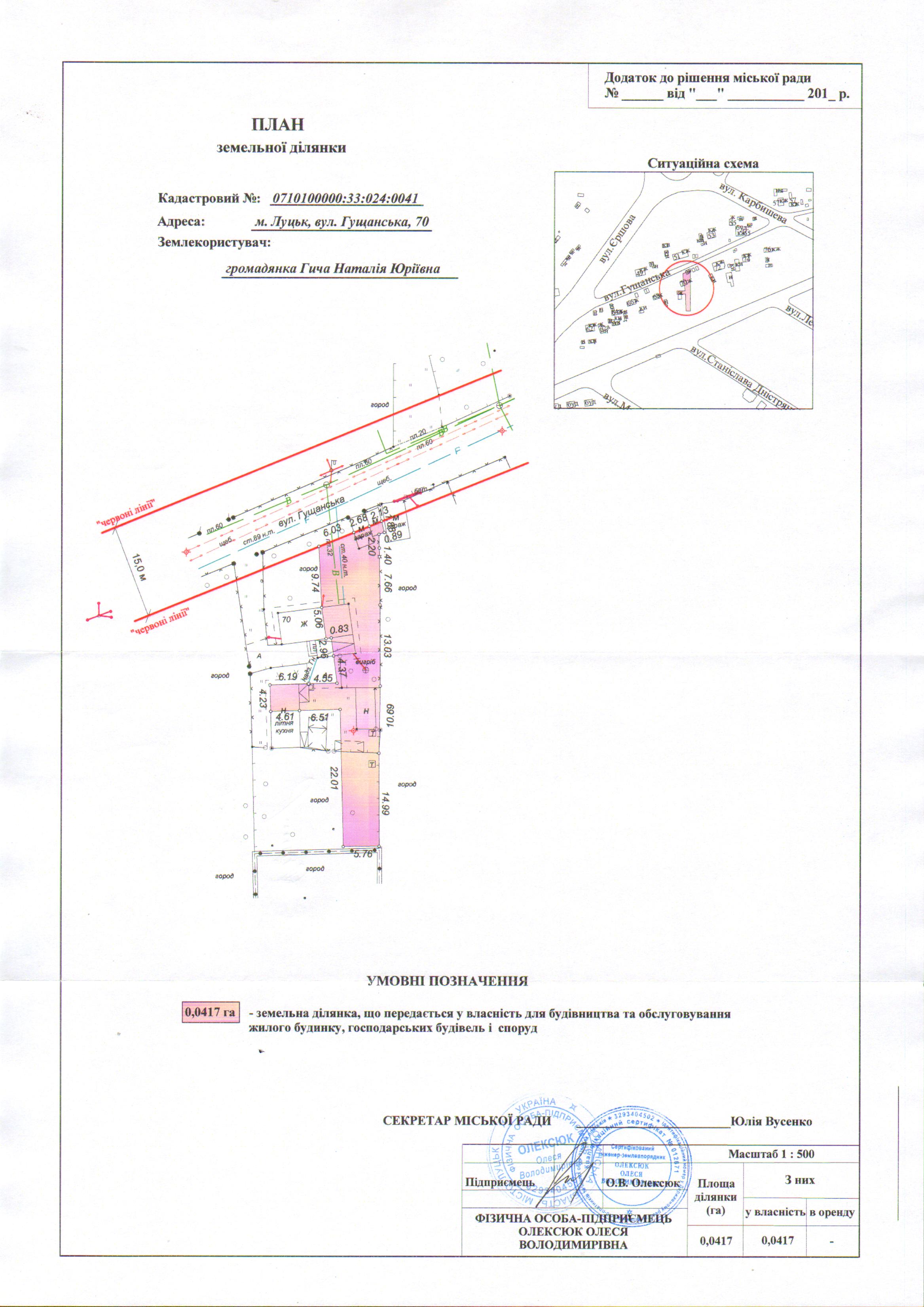 2. Передати громадянці Гичі Наталії Юріївні безоплатно у власність земельну ділянку на вул. Гущанській, 70 площею 0,0417 га, кадастровим номером 0710100000:33:024:0041 для будівництва та обслуговування жилого будинку, господарських будівель і споруд, згідно з додатком.