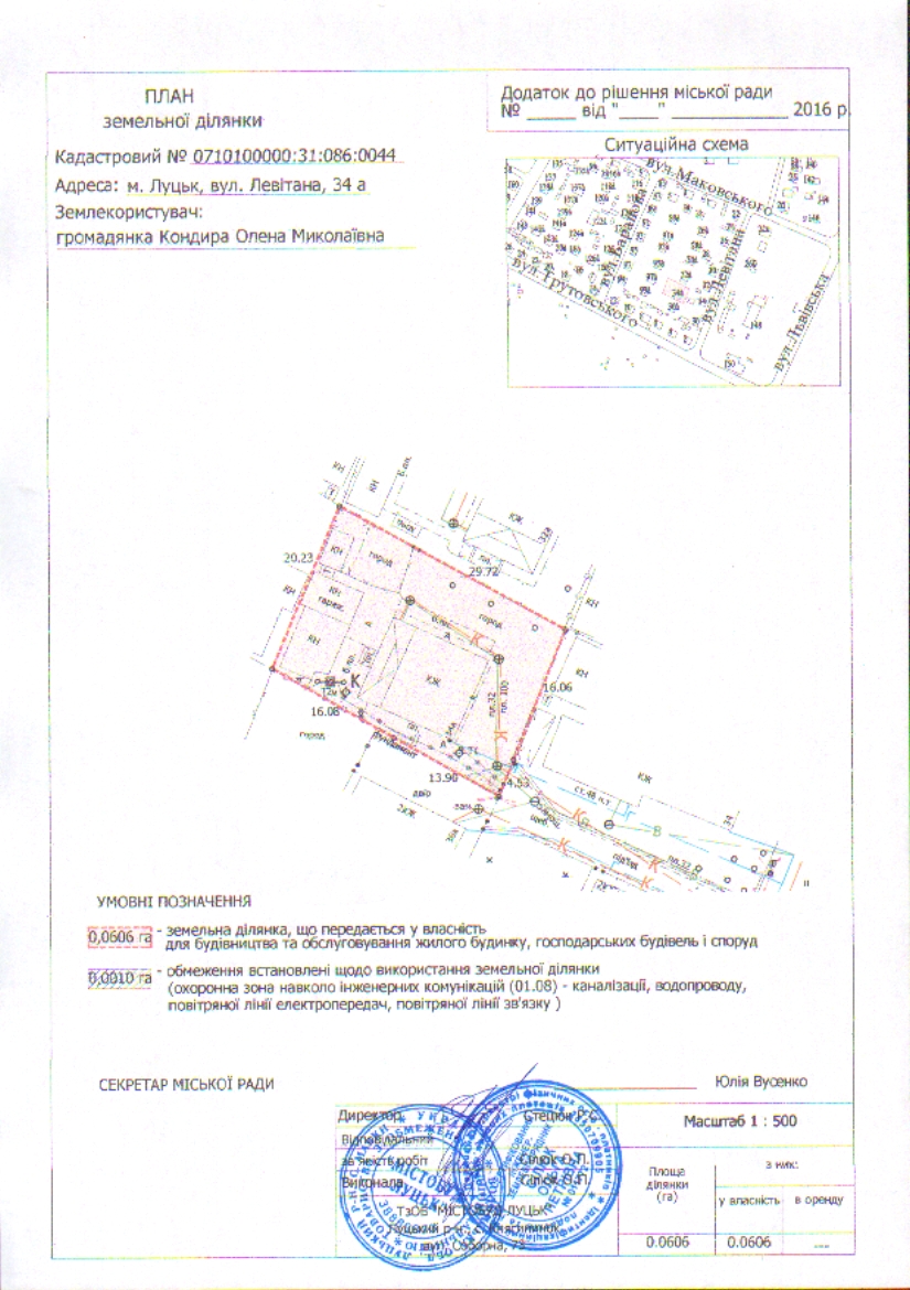 2. Передати громадянці Кондирі Олені Миколаївні безоплатно у власність земельну ділянку на вул. Левітана, 34а площею 0,0606 га, кадастровим номером 0710100000:31:086:0044 для будівництва та обслуговування жилого будинку, господарських будівель і споруд, згідно з додатком.