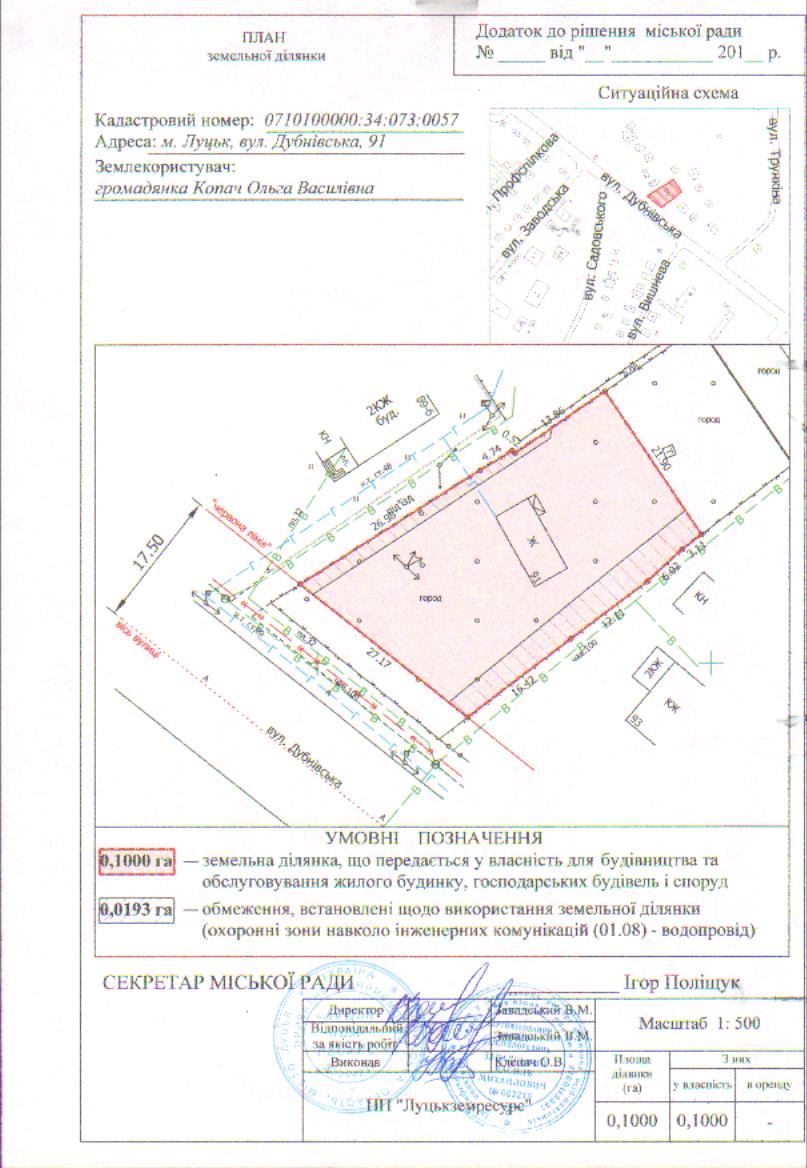1. Затвердити громадянці Копач Ользі Василівні технічну документацію із землеустрою щодо встановлення (відновлення) меж земельної ділянки в натурі (на місцевості) на вул. Дубнівській, 91 площею 0,1000 га, кадастровим номером 0710100000:34:073:0057 для будівництва та обслуговування жилого будинку, господарських будівель і споруд.