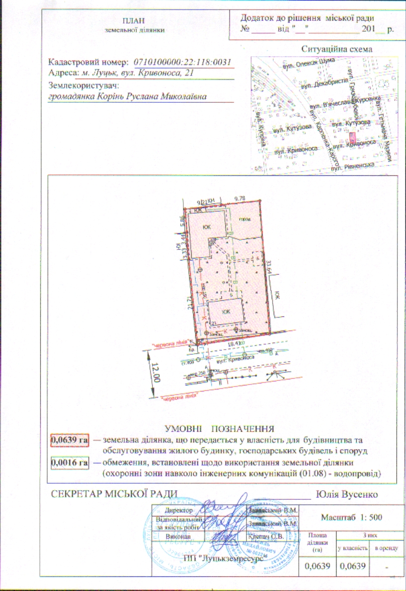 2. Передати громадянці Корінь Руслані Миколаївні безоплатно у власність земельну ділянку на вул. Кривоноса, 21 площею 0,0639 га, кадастровим номером 0710100000:22:118:0031 для будівництва та обслуговування жилого будинку, господарських будівель і споруд, згідно з додатком.