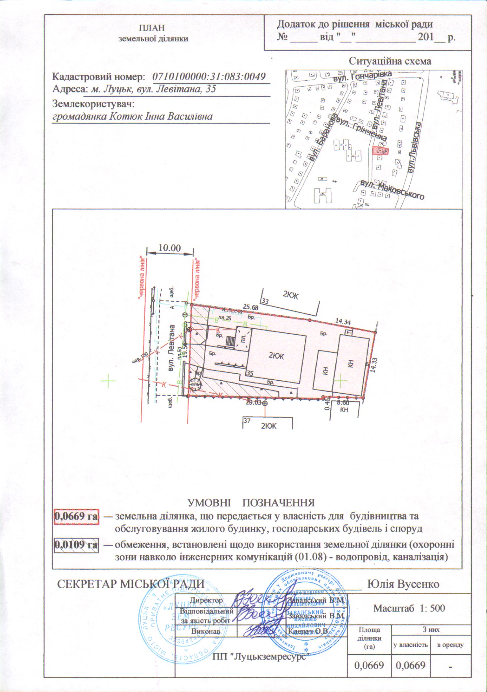 2. Передати громадянці Котюк Інні Василівні безоплатно у власність земельну ділянку на вул. Левітана, 35 площею 0,0669 га, кадастровим номером 0710100000:31:083:0049 для будівництва та обслуговування жилого будинку, господарських будівель і споруд, згідно з додатком.