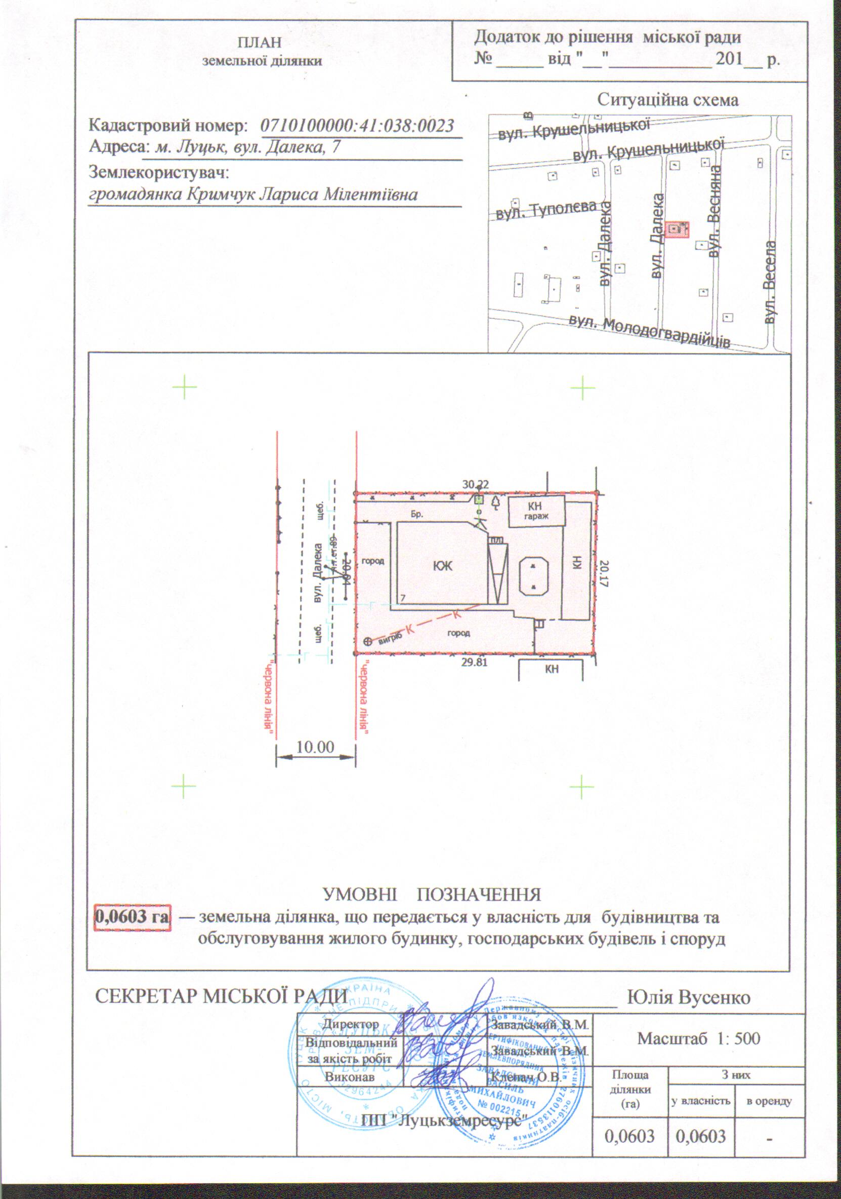 2. Передати громадянці Кримчук Ларисі Мілентіївні безоплатно у власність земельну ділянку на вул. Далекій, 7 площею 0,0603 га, кадастровим номером 0710100000:41:038:0023 для будівництва та обслуговування жилого будинку, господарських будівель і споруд, згідно з додатком.