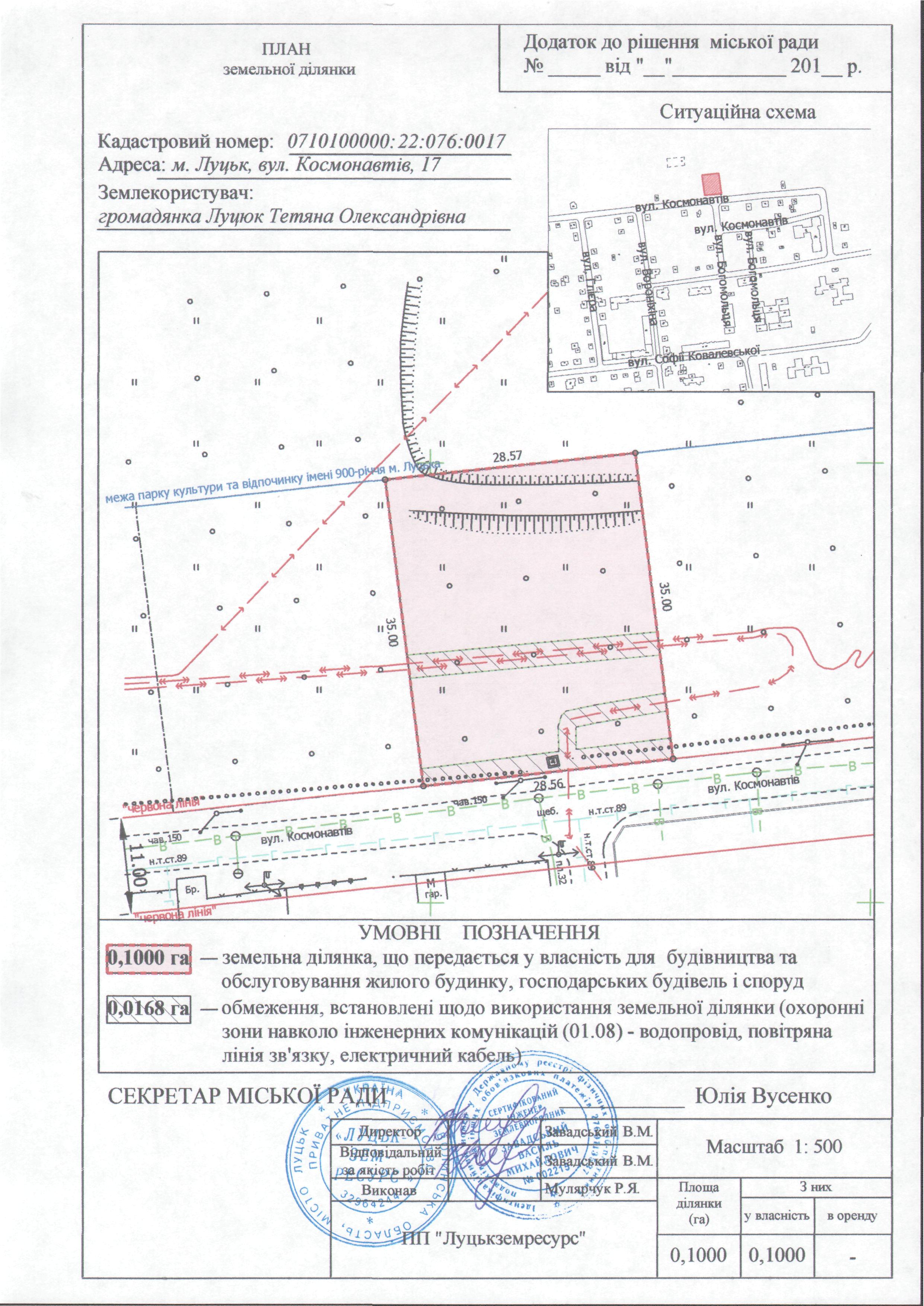 2. Передати громадянці Луцюк Тетяні Олександрівні безоплатно у власність земельну ділянку на вул. Космонавтів, 17 площею 0,1000 га, кадастровим номером 0710100000:22:076:0017 для будівництва та обслуговування жилого будинку, господарських будівель і споруд, згідно з додатком.