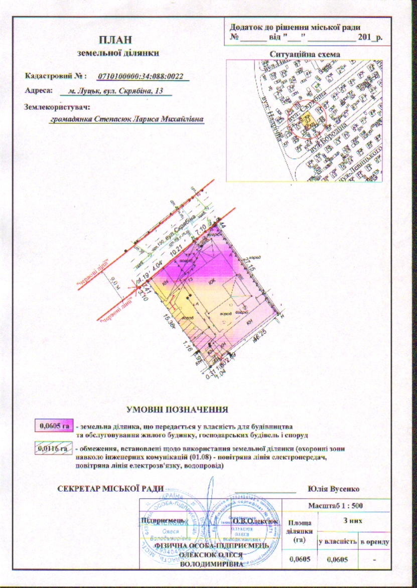 2. Передати громадянці Степасюк Ларисі Михайлівні безоплатно у власність земельну ділянку на вул. Скрябіна, 13 площею 0,0605 га, кадастровим номером 0710100000:34:088:0022 для будівництва та обслуговування жилого будинку, господарських будівель і споруд, згідно з додатком.