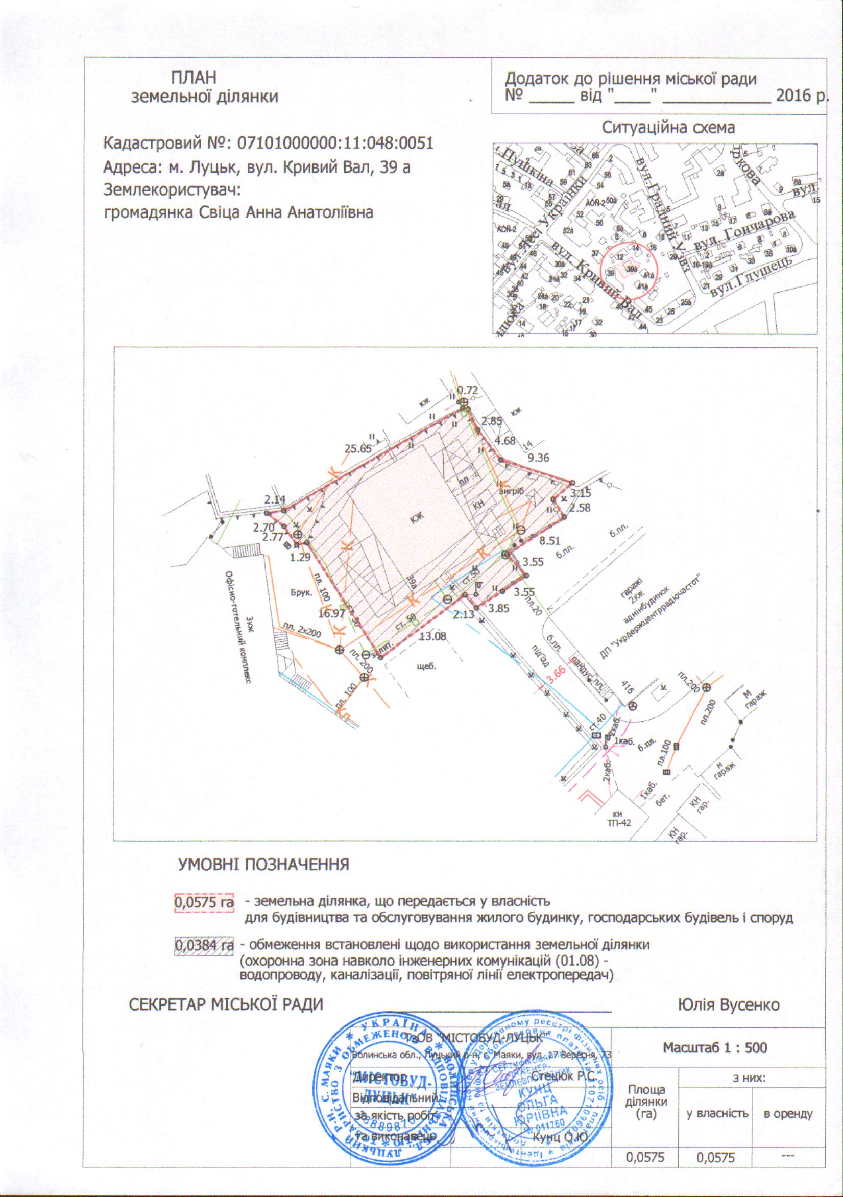 2. Передати громадянці Свіці Анні Анатоліївні безоплатно у власність земельну ділянку на вул. Кривий Вал, 39а площею 0,0575 га, кадастровим номером 0710100000:11:048:0051 для будівництва та обслуговування жилого будинку, господарських будівель і споруд, згідно з додатком.