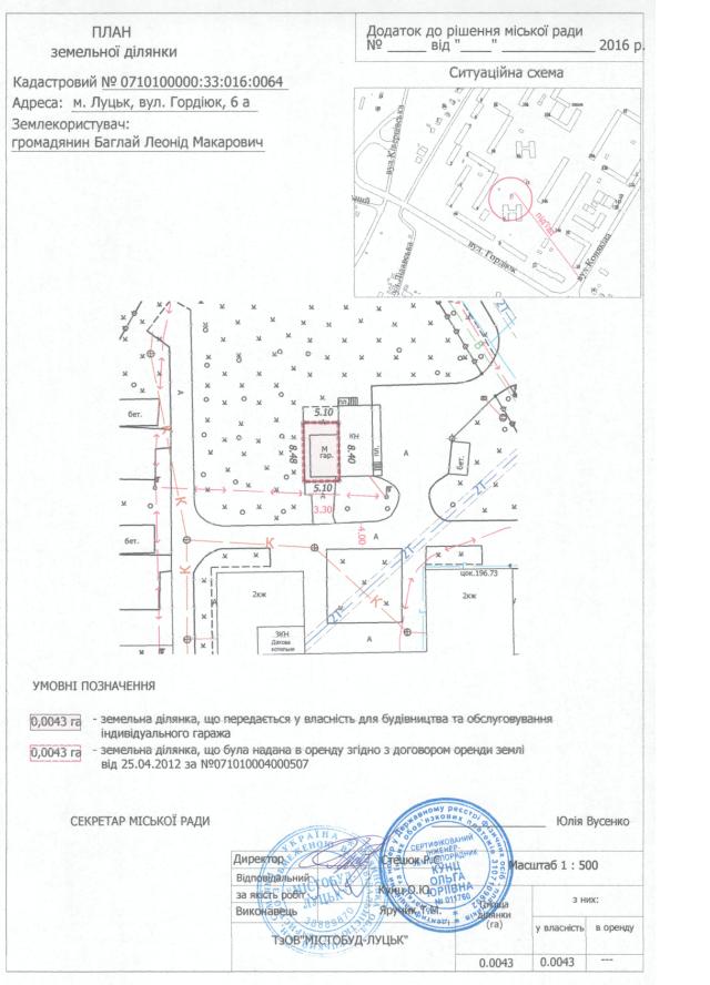 2. Передати громадянину Баглаю Леоніду Макаровичу безоплатно у власність земельну ділянку на вул. Гордіюк, 6-а площею 0,0043 га, кадастровим номером 0710100000:33:016:0064 для будівництва та обслуговування індивідуального гаража, згідно з додатком.