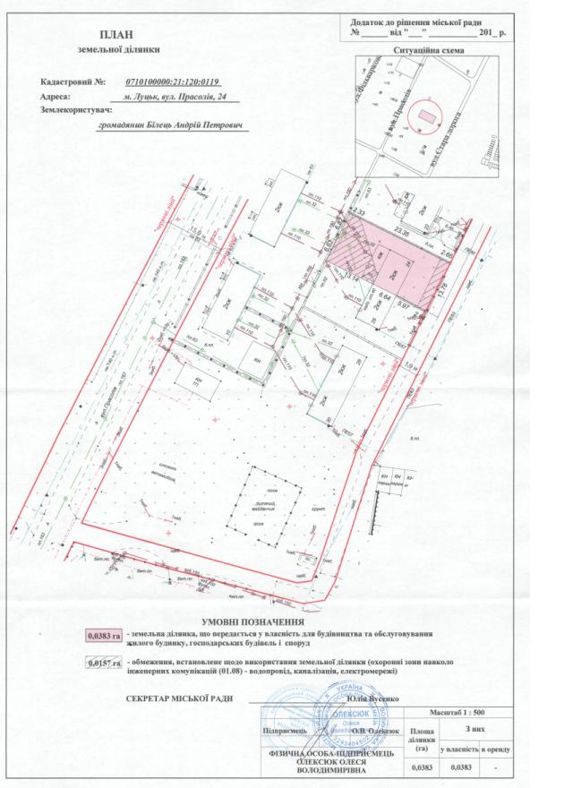 2. Передати громадянину Більцю Андрію Петровичу безоплатно у власність земельну ділянку на вул. Прасолів, 24 площею 0,0383 га, кадастровим номером 0710100000:21:120:0119 для будівництва та обслуговування жилого будинку, господарських будівель і споруд, згідно з додатком.
