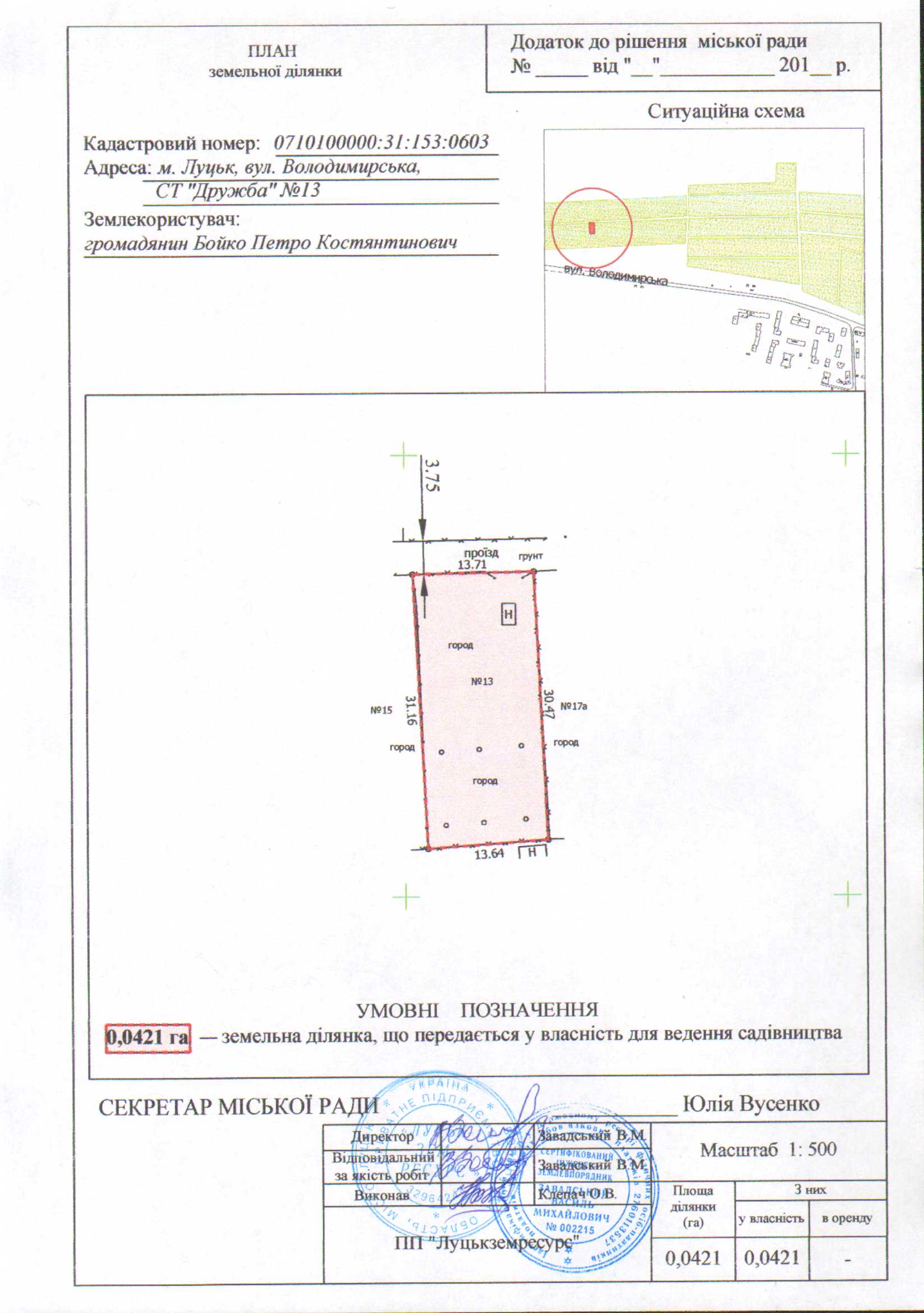 2. Передати громадянину Бойку Петру Костянтиновичу безоплатно у власність земельну ділянку на вул. Володимирській в садівничому товаристві «Дружба № 13 площею 0,0421 га, кадастровим номером 0710100000:31:153:0603 для ведення садівництва, згідно з додатком.