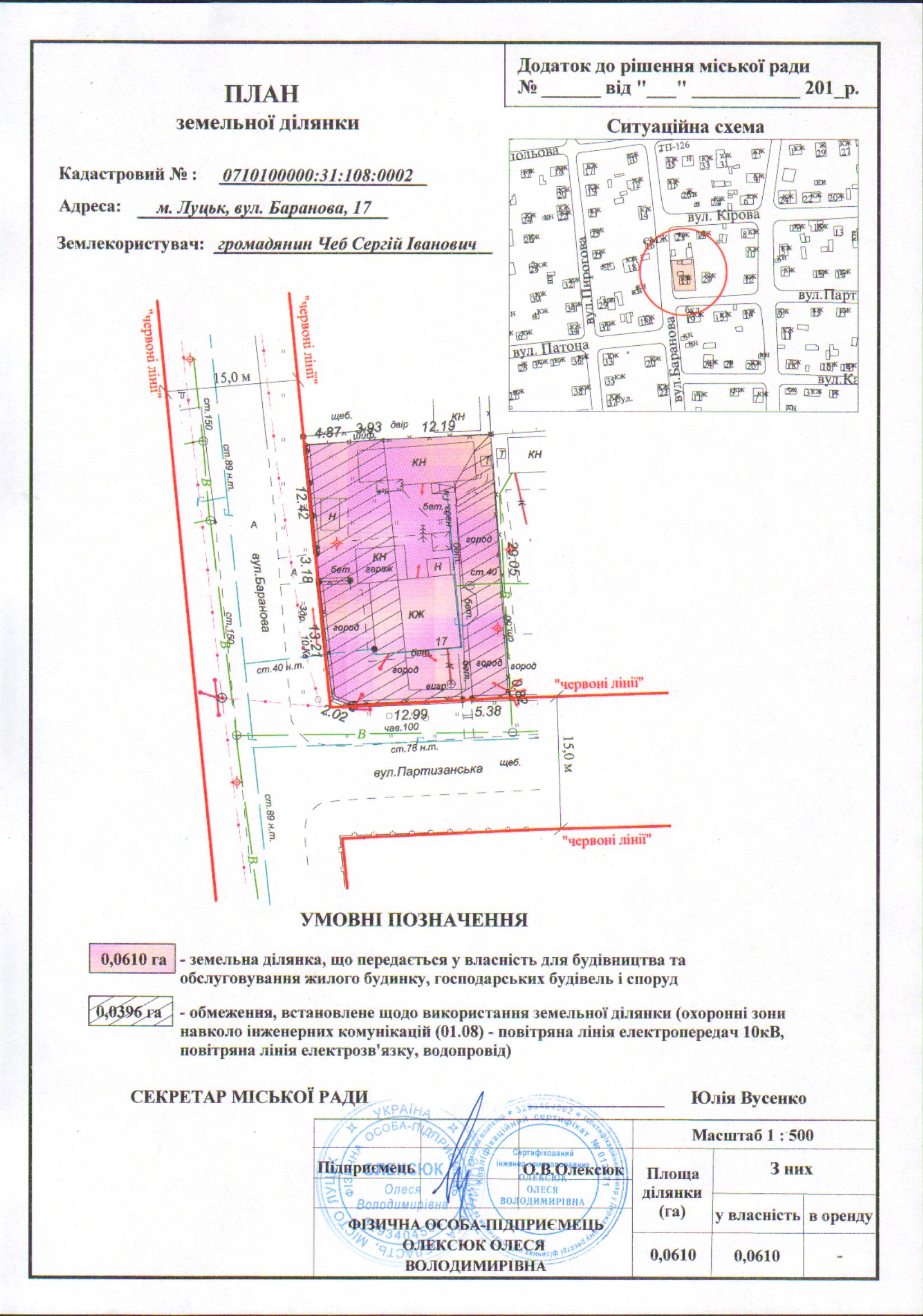2. Передати громадянину Чебу Сергію Івановичу безоплатно у власність земельну ділянку на вул. Баранова, 17 площею 0,0610 га, кадастровим номером 0710100000:31:108:0002 для будівництва та обслуговування жилого будинку, господарських будівель і споруд, згідно з додатком.