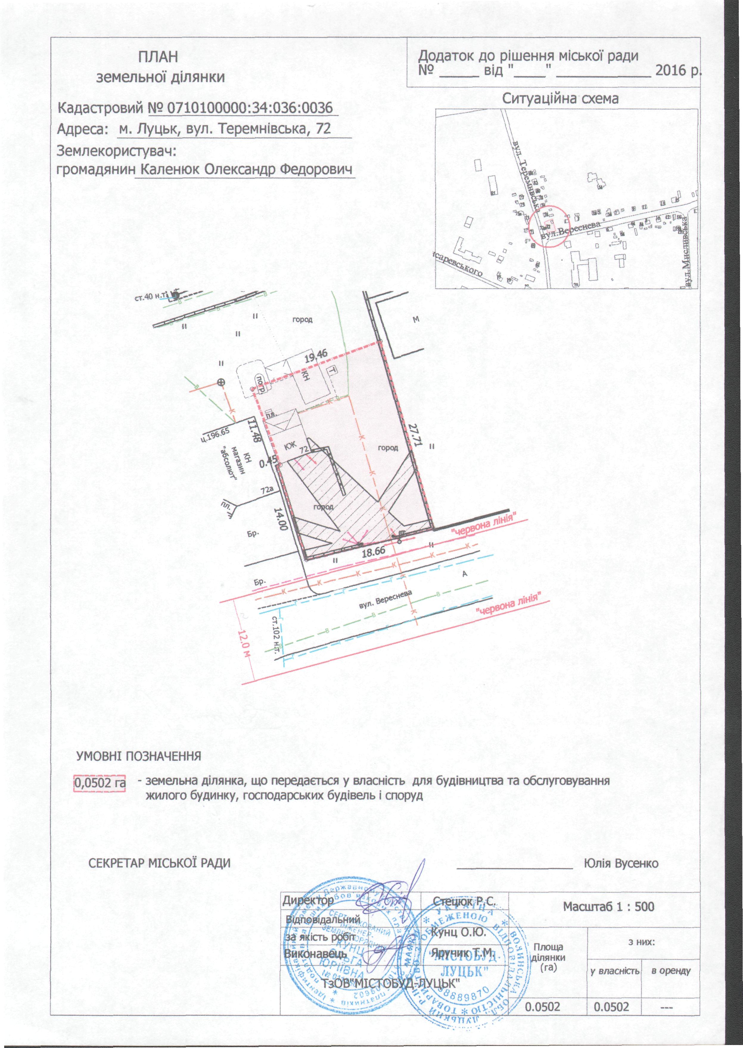 2. Передати громадянину Каленюку Олександру Федоровичу безоплатно у власність земельну ділянку на вул. Теремнівській, 72 площею 0,0502 га, кадастровим номером 0710100000:34:036:0036 для будівництва та обслуговування жилого будинку, господарських будівель і споруд, згідно з додатком.