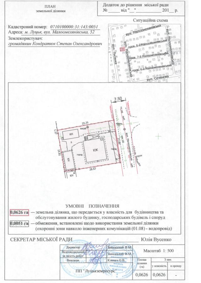 2. Передати громадянину Кондратюку Степану Олександровичу безоплатно у власність земельну ділянку на вул. Малоомелянівській, 52 площею 0,0626 га, кадастровим номером 0710100000:31:143:0051 для будівництва та обслуговування жилого будинку, господарських будівель і споруд, згідно з додатком.