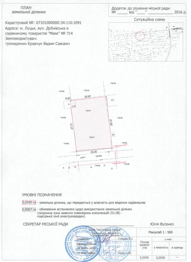 2. Передати громадянину Кравчуку Вадиму Савовичу безоплатно у власність земельну ділянку на вул. Дубнівській в садівничому товаристві «Маяк» № 714 площею 0,0540 га, кадастровим номером 0710100000:34:110:1091 для ведення садівництва, згідно з додатком.