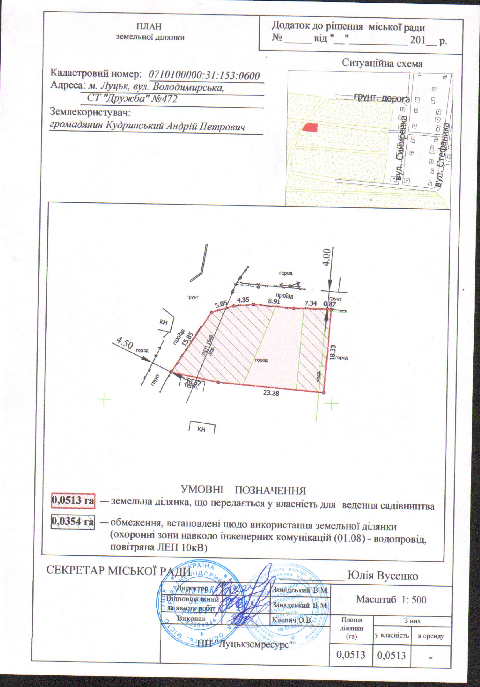 2. Передати громадянину Кудринському Андрію Петровичу безоплатно у власність земельну ділянку на вул. Володимирській в садівничому товаристві «Дружба» № 472 площею 0,0513 га, кадастровим номером 0710100000:31:153:0600 для ведення садівництва, згідно з додатком.
