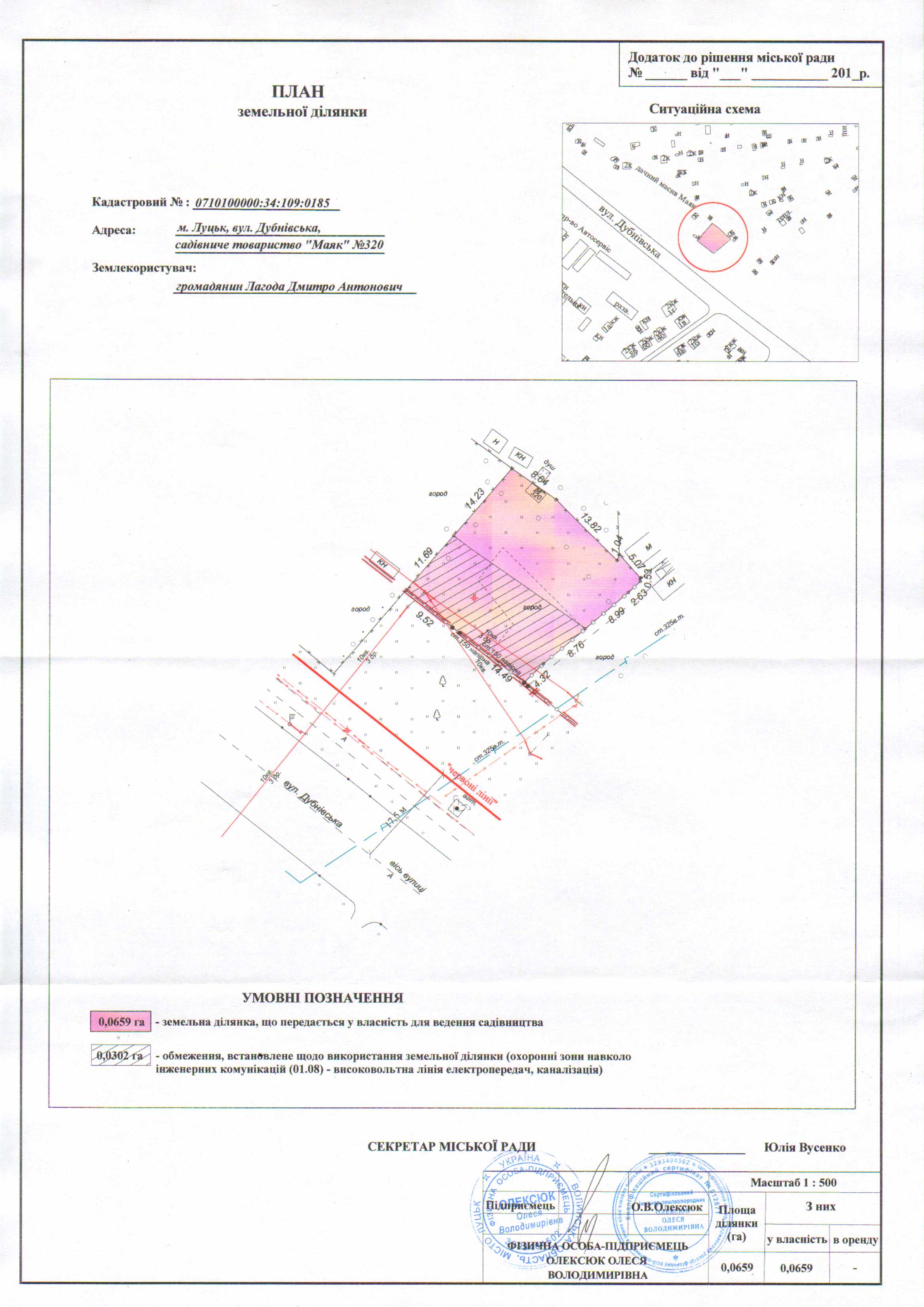 2. Передати громадянину Лагоді Дмитру Антоновичу безоплатно у власність земельну ділянку на вул. Дубнівській в садівничому товаристві «Маяк» № 320 площею 0,0659 га, кадастровим номером 0710100000:34:109:0185 для ведення садівництва, згідно з додатком.