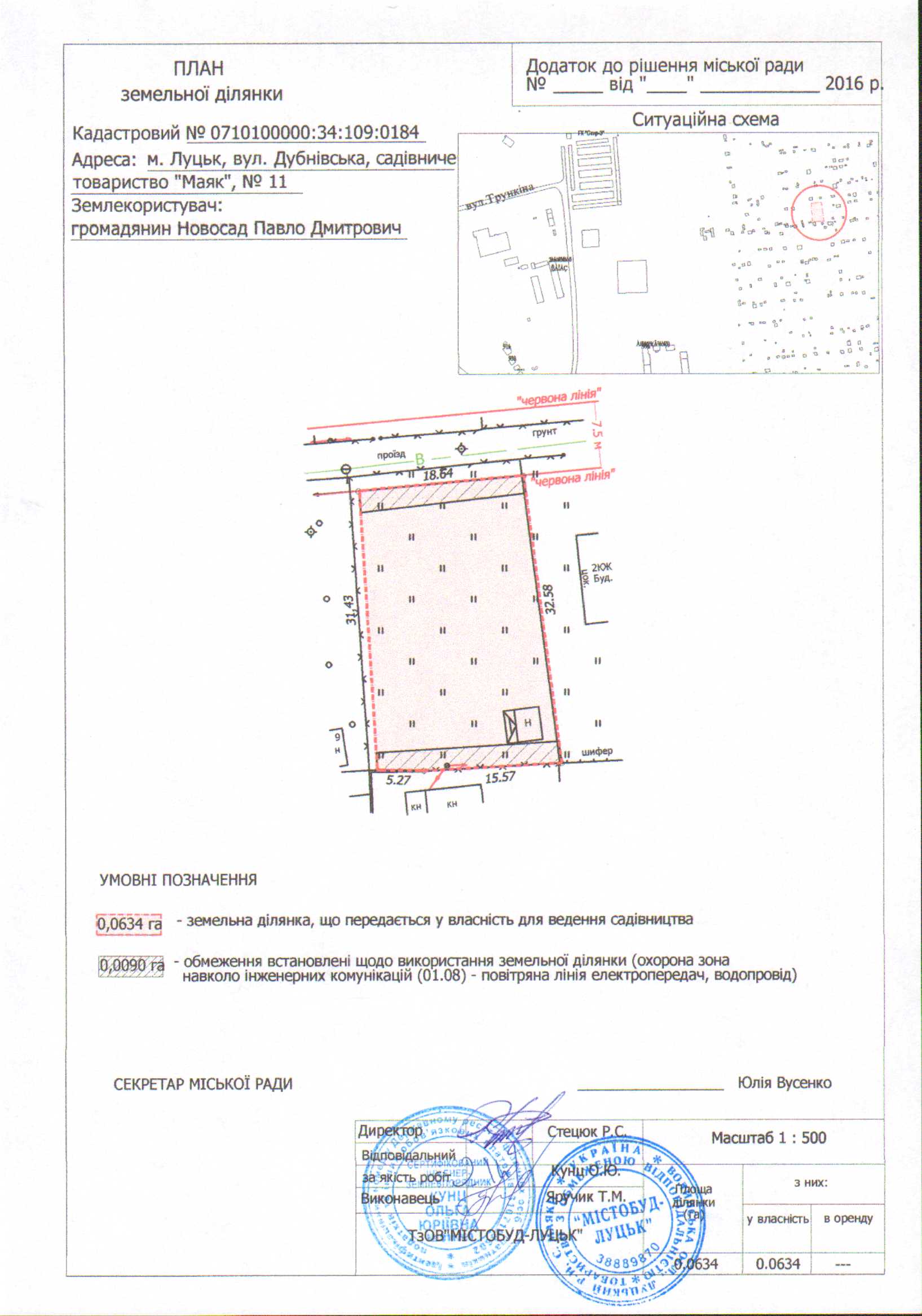 2. Передати громадянину Новосаду Павлу Дмитровичу безоплатно у власність земельну ділянку на вул. Дубнівській в садівничому товаристві «Маяк» № 11 площею 0,0634 га, кадастровим номером 0710100000:34:109:0184 для ведення садівництва, згідно з додатком.