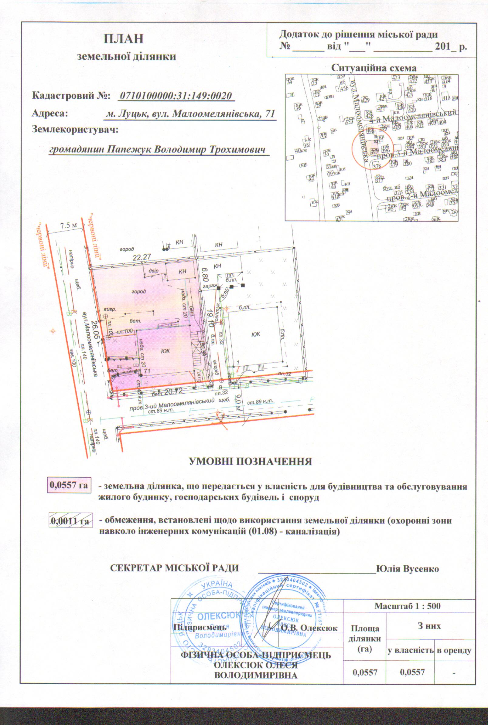 2. Передати громадянину Папежуку Володимиру Трохимовичу безоплатно у власність земельну ділянку на вул. Малоомелянівській, 71 площею 0,0557 га, кадастровим номером 0710100000:31:149:0020 для будівництва та обслуговування жилого будинку, господарських будівель і споруд, згідно з додатком.