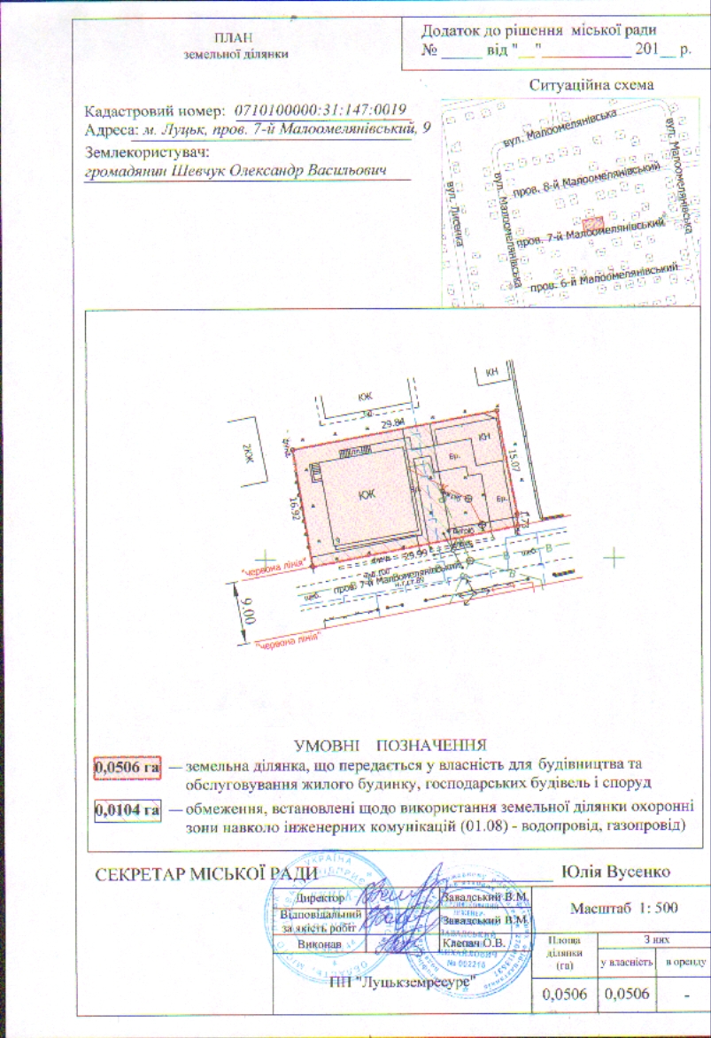 2. Передати громадянину Шевчуку Олександру Васильовичу безоплатно у власність земельну ділянку на пров. 7-ому Малоомелянівському, 9 площею 0,0506 га, кадастровим номером 0710100000:31:147:0019 для будівництва та обслуговування жилого будинку, господарських будівель і споруд, згідно з додатком.