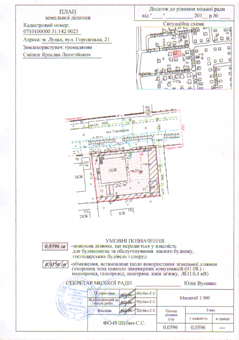 2. Передати громадянину Смізюку Ярославу Леонтійовичу безоплатно у власність земельну ділянку на вул. Городецькій, 21 площею 0,0596 га, кадастровим номером 0710100000:31:142:0023 для будівництва та обслуговування жилого будинку, господарських будівель і споруд, згідно з додатком.