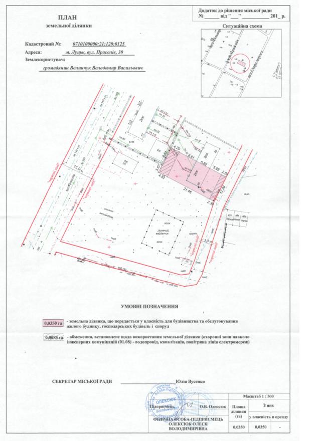 2. Передати громадянину Волинчуку Володимиру Васильовичу безоплатно у власність земельну ділянку на вул. Прасолів, 30 площею 0,0350 га, кадастровим номером 0710100000:21:120:0125 для будівництва та обслуговування жилого будинку, господарських будівель і споруд, згідно з додатком.