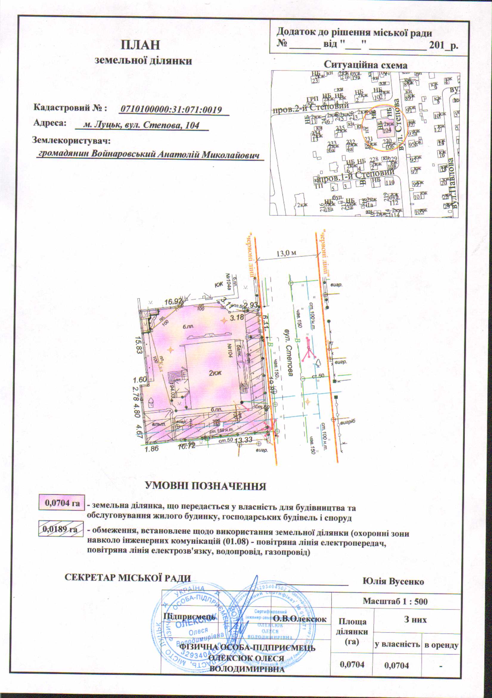 2. Передати громадянину Войнаровському Анатолію Миколайовичу безоплатно у власність земельну ділянку на вул. Степовій, 104 площею 0,0704 га, кадастровим номером 0710100000:31:071:0019 для будівництва та обслуговування жилого будинку, господарських будівель і споруд, згідно з додатком.